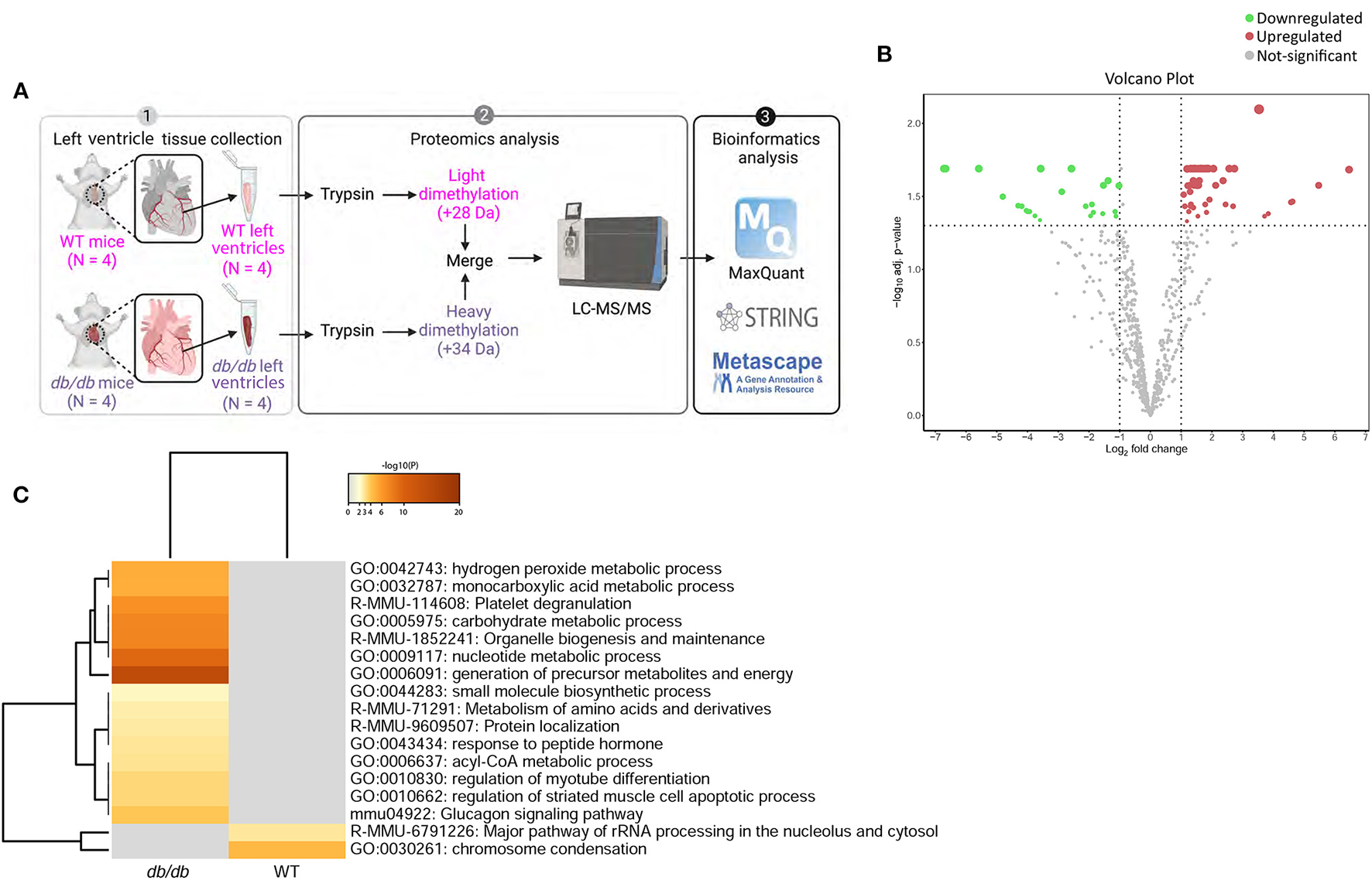 Process enrichment analysis of differentially expressed proteins in db/db mice. (A) Experimental design. Left ventricles from WT-control (n = 4) and db/db (n = 4) mice were labeled with light or heavy formaldehyde, quantified by shotgun proteomics and analyzed using MaxQuant. (B) Volcano plot of all proteins identified. The points indicate different proteins that display both large magnitude fold-changes (x-axis) and high statistical significance (y-axis). The dashed horizontal line shows the p-values cut-off, and the two vertical dashed lines indicate downregulated (green) and upregulated (red) proteins in the left ventricle of db/db mice. Gray points show the non-significantly differently expressed proteins. (C) Heatmap of top 17 enriched terms across upregulated and downregulated proteins in db/db mice using Metascape. Darker color indicates a lower p-value.