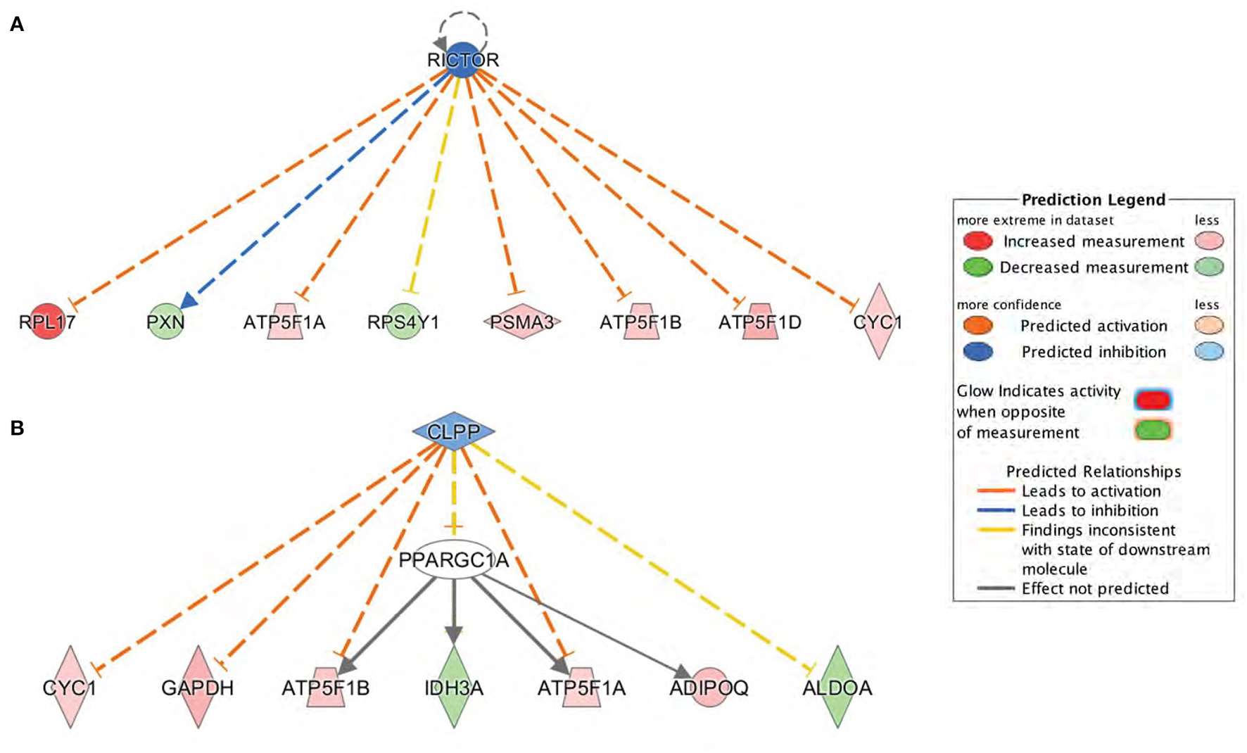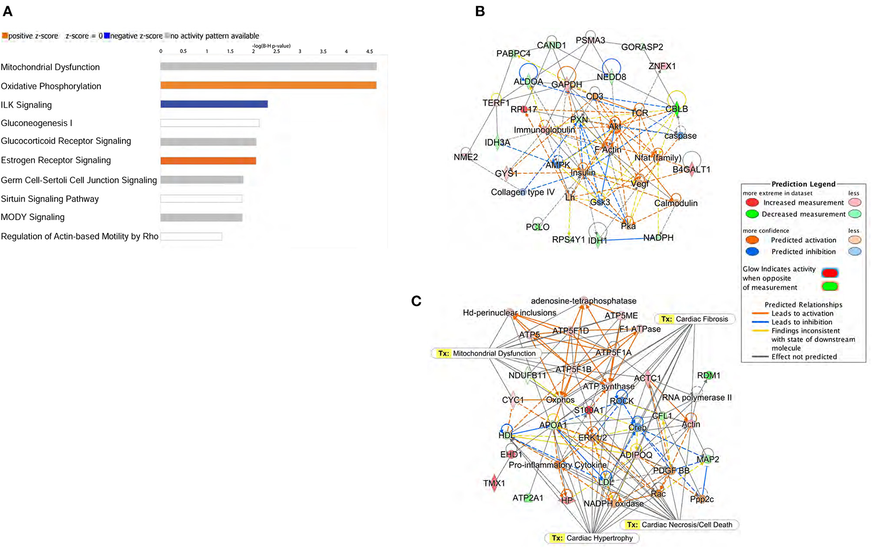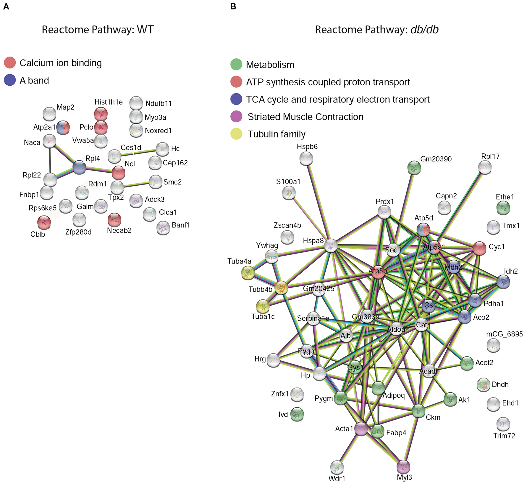 To further appreciate their biological significance, the differentially expressed proteins were subjected to protein network analysis using the Ingenuity Pathway Analysis (IPA) software (Qiagen Inc.) based on curated databases from the literature. These include binding, activation, inhibition, expression, and other protein interactions to generate pathways according to the function of the molecules involved. IPA is a powerful tool widely used in the omics field to suggest/predict the effects of specific conditions or drugs on biological outcomes. Datasets containing protein identifiers (UniProt) and corresponding expression values (Log2 [Fold change]) of db/db vs. age-matched control were uploaded, and predicted networks were analyzed.