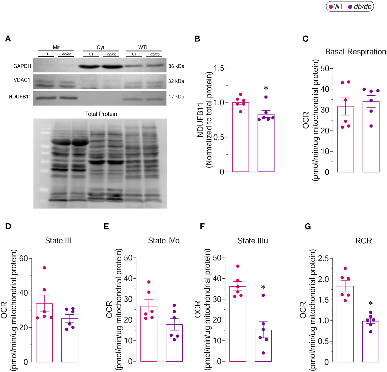 Western blot analysis was performed in the mitochondrial and cytoplasmic fractions obtained by the mitochondrial isolation kit for tissue (#ab110168, Abcam) as well as in the whole tissue lysates from LVs of db/db and WT mice to validate the purity of the mitochondrial isolation (Figure 7F). Briefly, equal amounts of proteins were separated using SDS-PAGE and electrophoretically transferred to PVDF membranes. Non-specific binding was blocked by incubation in 5% non-fat milk and 0.1% Tween 20 in Tris-buffered saline. The membranes were probed individually with specific primary antibodies against glyceraldehyde 3-phosphate dehydrogenase (GAPDH; 1:1000, #sc-32233, Santa Cruz Biotechnology), voltage-dependent anion channel 1 (VDAC1; 1:1000, #sc-390996, Santa Cruz Biotechnology) and NADH dehydrogenase (ubiquinone) 1 β subcomplex subunit 11 (NDUFB11; 1:1000, #sc-374370, Santa Cruz Biotechnology). After probing with the HRP-linked secondary antibody (anti-mouse IgG, 1:3000, #7076, Cell Signaling Technology), membranes were incubated with SuperSignal West Femto Maximum Sensitivity Substrate (#34096; Thermo Scientific), and chemiluminescence was recorded using iBright™ FL1500 Imaging System (Invitrogen). Immunoreactive bands were quantified by the iBright Analysis Software using the total protein detection (No-Stain Protein Labeling Reagent, #A44717, Invitrogen) as a normalization control.