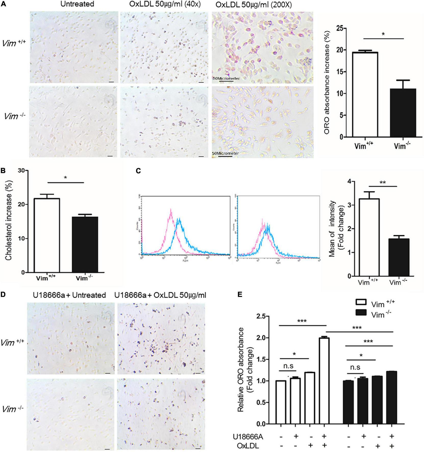 Vim −/– murine peritoneal macrophages exhibit less foam cell formation and less uptake of oxLDL than Vim+/+ macrophages. (A) Left, Representative images of ORO staining of Vim+/+ mouse macrophages and Vim−/– mouse macrophages. Both macrophages were incubated with or without oxLDL (50 μg/ml) for 18 h. Right: the absorbance of ORO eluted from macrophages in (A). The absorbance increases induced by oxLDL treatment were compared between Vim+/+ and Vim−/– macrophages. (B) Increases of Intracellular cholesterol concentration in Vim+/+ mouse macrophages and Vim−/– mouse macrophages were compared after incubation with oxLDL 50 μg/ml for 18 h. (C) Left, Flow cytometry. Vim+/+ mouse macrophages and Vim−/– mouse macrophages were pretreated with non-labeled oxLDL for 30 min, and then exposed to oxLDL complexed with DiI (DiI-oxLDL, 50 μg/ml) for 5 min and fixed with 4% paraformaldehyde. The fluorescence intensities of these cells were measured using flow cytometry. Red line; without oxLDL, Blue line; with oxLDL. Right graph: Geometric mean fluorescence intensities were compared between Vim+/+ and Vim−/– macrophages incubated with oxLDL. The bar graph of comparison was generated from 3 times of separate experiments. (D) Representative images of ORO staining of Vim+/+ and Vim−/– mouse macrophages. Both macrophages were pre-incubated with U18666a (NPC inhibitor, 10 nM) for 90 min and then incubated with or without oxLDL (50 μg/ml) for 18 h. (E) Relative ratio of absorbance of eluted ORO in (A,D). The ORO was extracted using isopropanol and the absorbance representing intracellular lipids was detected at 540 nm. (*p < 0.05, **p < 0.01, ***p < 0.001. The graph shows mean ± SEM for triplicated determinants of 3 separate experiments).