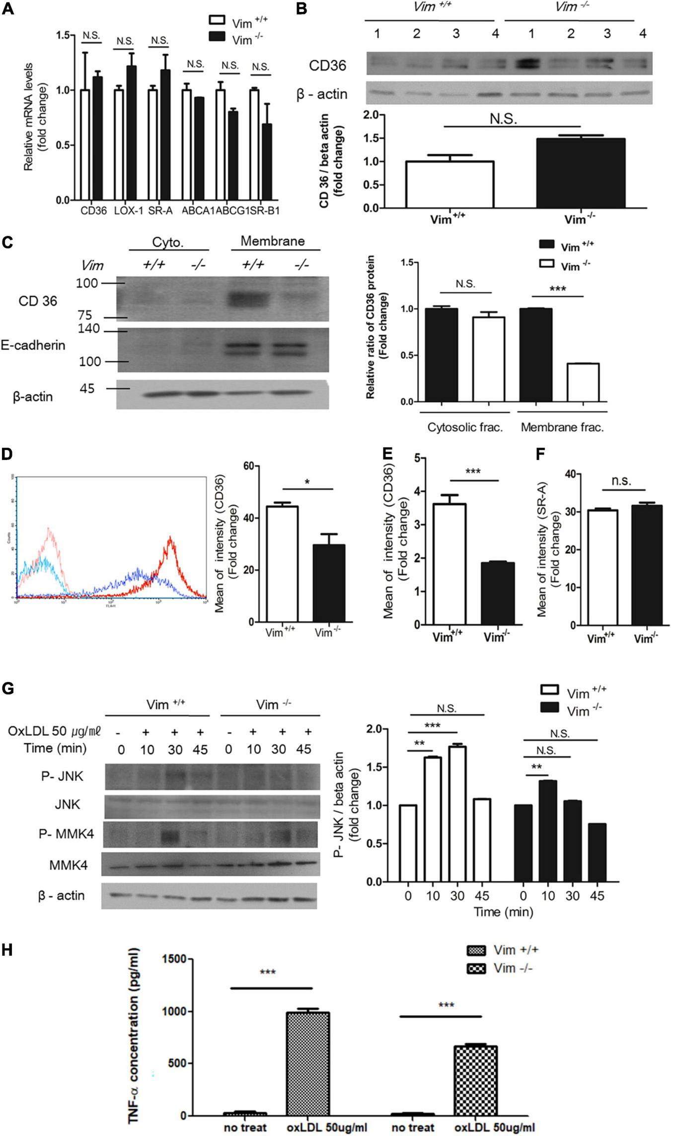 Plasma membrane CD36 in Vim−/– macrophages was less than in Vim+/+ macrophages. (A) Quantitative real-time PCR was performed with RNAs from Vim+/+ and Vim−/– murine peritoneal macrophages. GAPDH was used as the internal control. (B) Western blot analysis for CD36 was performed using lysates of Vim+/+ (n = 4) and Vim−/– (n = 4) murine peritoneal macrophages. Each lysates were harvested from different mice. Beta actin was used as the internal control. (C) Western blot analysis for CD36 was performed using fractionated lysates of Vim+/+ and Vim−/– murine peritoneal macrophages. E-cadherin was used as the marker for plasma membrane fraction and GAPDH was used as the marker for cytosolic fraction. (D) Left, The representative flow cytometry data of Vim+/+ murine peritoneal macrophages and Vim−/– murine peritoneal macrophages with APC conjugated monoclonal antibody specific for CD36. Both cell types were incubated with either IgG control (Vim+/+: pink, Vim−/–: light blue) or with CD36 antibody (Vim+/+: red, Vim−/–: dark blue). Right, Comparison of fluorescence intensities representing cell surface-localized CD36 between Vim+/+ and Vim−/– murine peritoneal macrophages. (E) Flow cytometry. Comparison of fluorescence intensities representing cell surface-localized CD36 between Vim+/+ and Vim−/– murine bone marrow-derived macrophages (BMDM). (F) Flow cytometry. Comparison of fluorescence intensities representing cell surface-localized SR-A between Vim+/+ and Vim−/– murine peritoneal macrophages. (G) Western blot analysis for phospho-JNK, phospho-MMK4 and beta actin using lysates of Vim+/+ and Vim−/– murine peritoneal macrophages. Cells were incubated with oxLDL (50 μg/ml) for indicated times. Beta actin was used as the internal control. *p < 0.05, **p < 0.01, ***p < 0.001. The graph shows mean ± SEM for triplicated determinants of the experiments. (H)Vim+/+ and Vim−/– macrophages were treated with or without oxLDL (50 μg/ml) and TNF-α released by the macrophages in the media was measured by ELISA. ***p < 0.001.