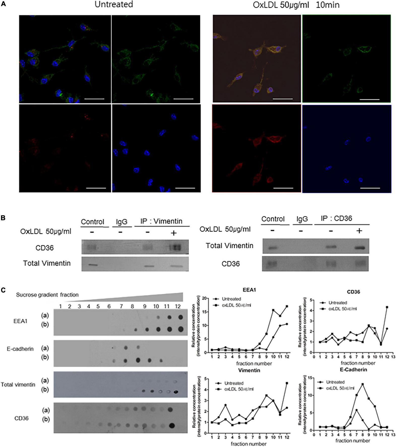 We isolated endosomal fractions using sucrose gradient fractionation. Early endosomes were labeled by early endosome marker EEA1 and are in the 10th, 11th, and 12th fractions. There were CD36 and vimentin in early endosome fractions. In addition, the amounts of CD36 and vimentin in the early endosome fractions were increased when the cells were treated with oxLDL (50 μg/ml) (Figure 3C).