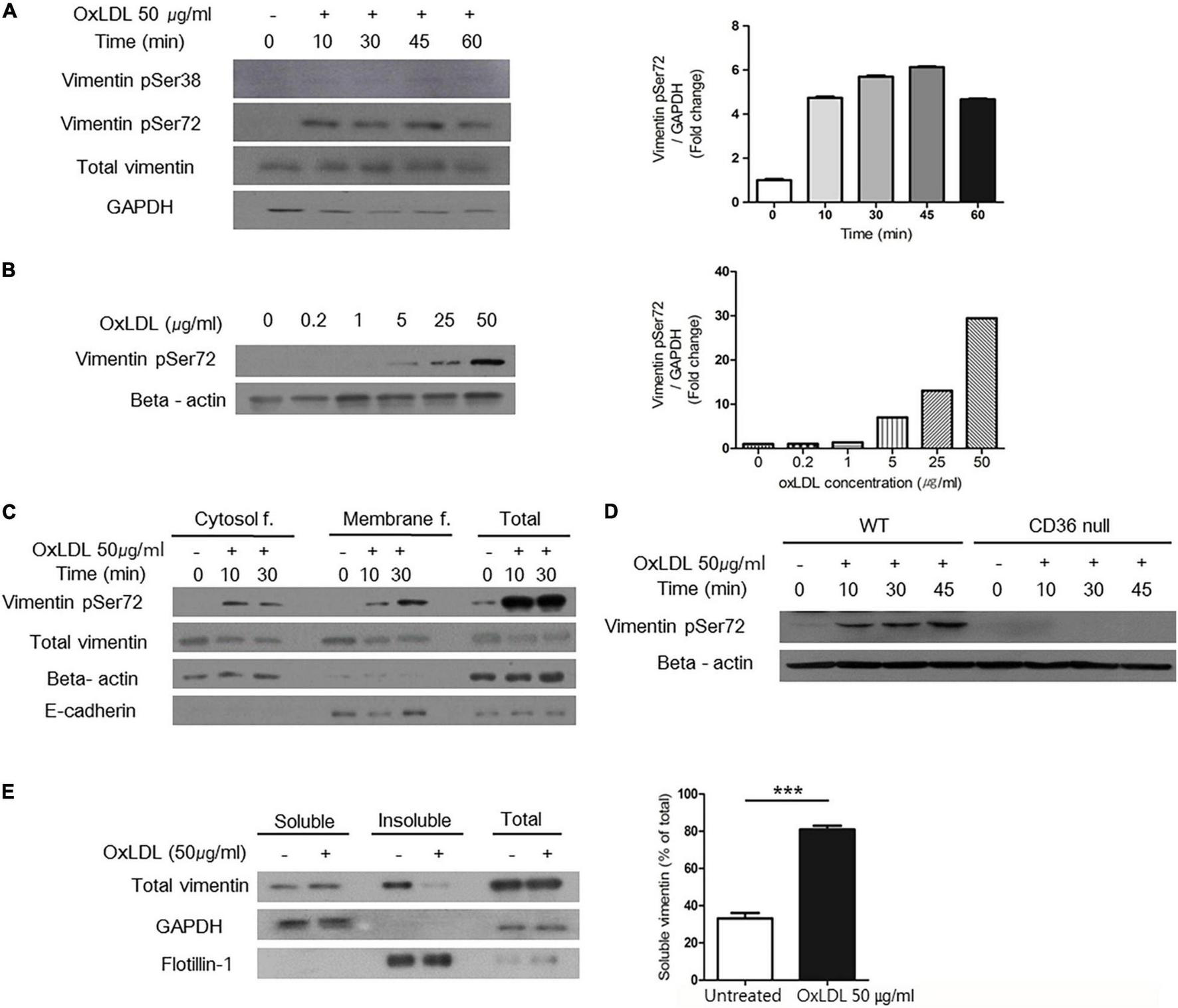 OxLDL-induced vimentin (Ser72) phosphorylation depended on CD36 and led to disassembly of vimentin filaments. (A) Western blots for phosphorylated vimentin (Ser72) and phosphorylated vimentin (Ser38) using cell lysates of wild type murine peritoneal macrophages. Cells were treated with oxLDL (50 μg/ml) for indicated times. (B) Western blot for phosphorylated vimentin (Ser72) using cell lysates of wild type murine peritoneal macrophages. Cells were treated with various concentrations of oxLDL for 10 min. (C) Wild type murine peritoneal macrophages were incubated with OxLDL (50 μg/ml) for indicated times. Cytosolic and membrane fractions were separated using buffer-based protocol. E-cadherin was used as a marker for plasma membrane fraction and beta actin was used as a marker for cytosolic fraction. (D) Wild type and CD36 null murine peritoneal macrophages were incubated with myeloperoxidase (MPO)-modified LDL (oxLDL, 50 μg/ml) for indicated times. The lysates were analyzed by western blot for phosphorylated vimentin (Ser72). (E) Macrophages were treated with oxLDL (50 μg/ml) for 10 min. Cytosolic fraction is divided based on the solubility in triton X-100. Western blot for vimentin was done. GAPDH was used as a marker for soluble fraction and flotilin-1 was used as a marker for insoluble fraction. ***p < 0.001. The graph shows mean ± SEM for triplicated determinants of the experiments.