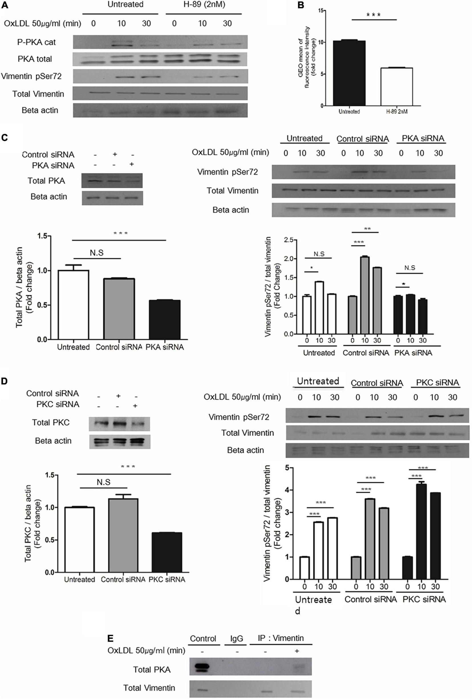 These data demonstrated that PKA is activated by oxLDL and mediates vimentin phosphorylation (Ser72).