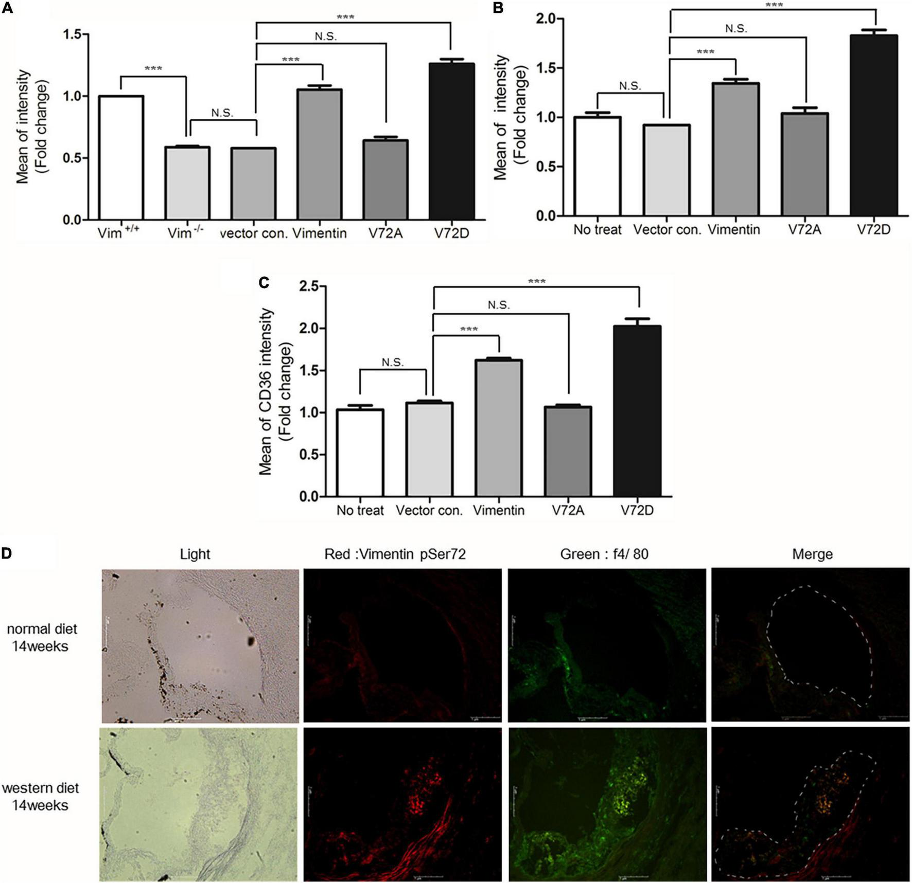 Since Vim−/– mouse macrophages showed less CD36 in plasma membrane than Vim+/+ mouse macrophages, we hypothesized that vimentin phosphorylation may influence CD36 trafficking from cytosol to membrane. To prove the hypothesis, we stained plasma membrane CD36 with fluorescently labeled anti-CD36 antibody and performed flow cytometry to measure the fluorescence intensities that represent the amount of CD36 localized in plasma membrane. CD36 localized in plasma membrane was 2.0 fold more in the macrophages with V72D compared with macrophages with V72A (Figure 6C). These data suggest that vimentin (Ser72) phosphorylation promotes translocation of CD36 to plasma membrane.