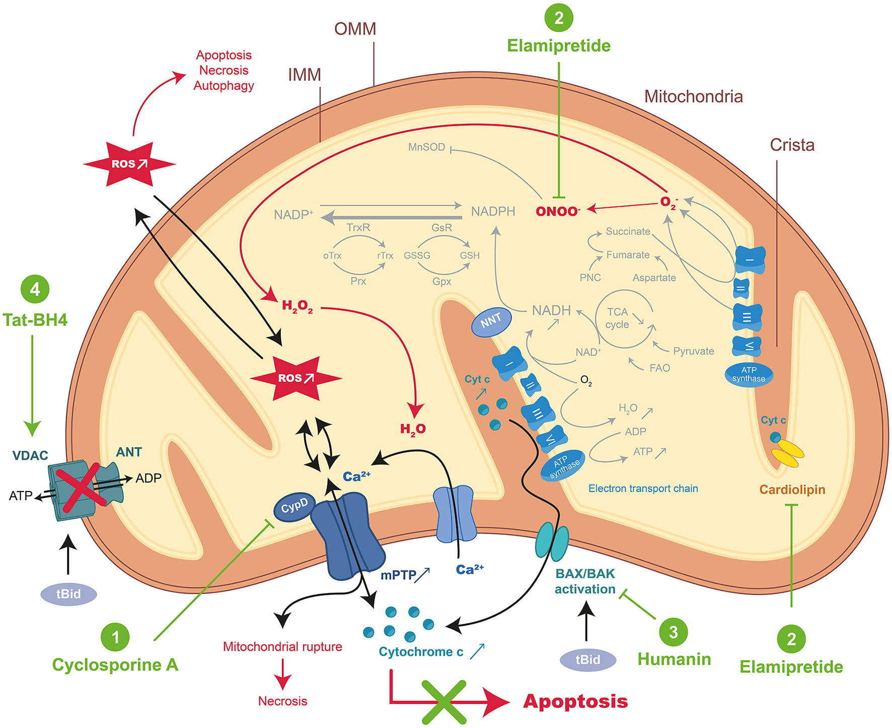 Schematic representation of mitochondrial-dependent apoptosis and mode of action of the therapeutic peptides during MIRI. During acute myocardial ischemia-reperfusion injury (MIRI), reactive oxygen species (ROS) burst and mitochondrial Ca2+ overload activate regulated cell death (RCD) resulting in apoptosis or necrosis through the mitochondrial permeability transition pore (mPTP) opening. Excessive ROS induced important changes in normal mitochondrial structure and function resulting in the disorder of mitochondrial metabolic function. Therapeutic peptides reducing intrinsic apoptosis during MIRI were highlighted in green: (1) Cyclosporine A (CsA), (2) Elamipretide, (3) Humanin, and (4) Tat-BH4. CypD, cyclophilin D; NNT, nicotinamide nucleotide transhydrogenase; FAO, fatty acid β-oxidation; Prx, peroxiredoxins; Gpx, glutathione peroxidase; GsR, glutathione reductase; Trx, thioredoxin; TrxR, thioredoxin reductase; GSH, glutathione; GSSG, oxidized glutathione; PNC, purine nucleotide cycle; tBid, truncated form of BH3 Interacting domain Death agonist; BAX, BCL2 associated X Apoptosis regulator; BAK, BCL-2 Antagonist/Killer 1; OMM, outer membrane, IMM, inner membrane.