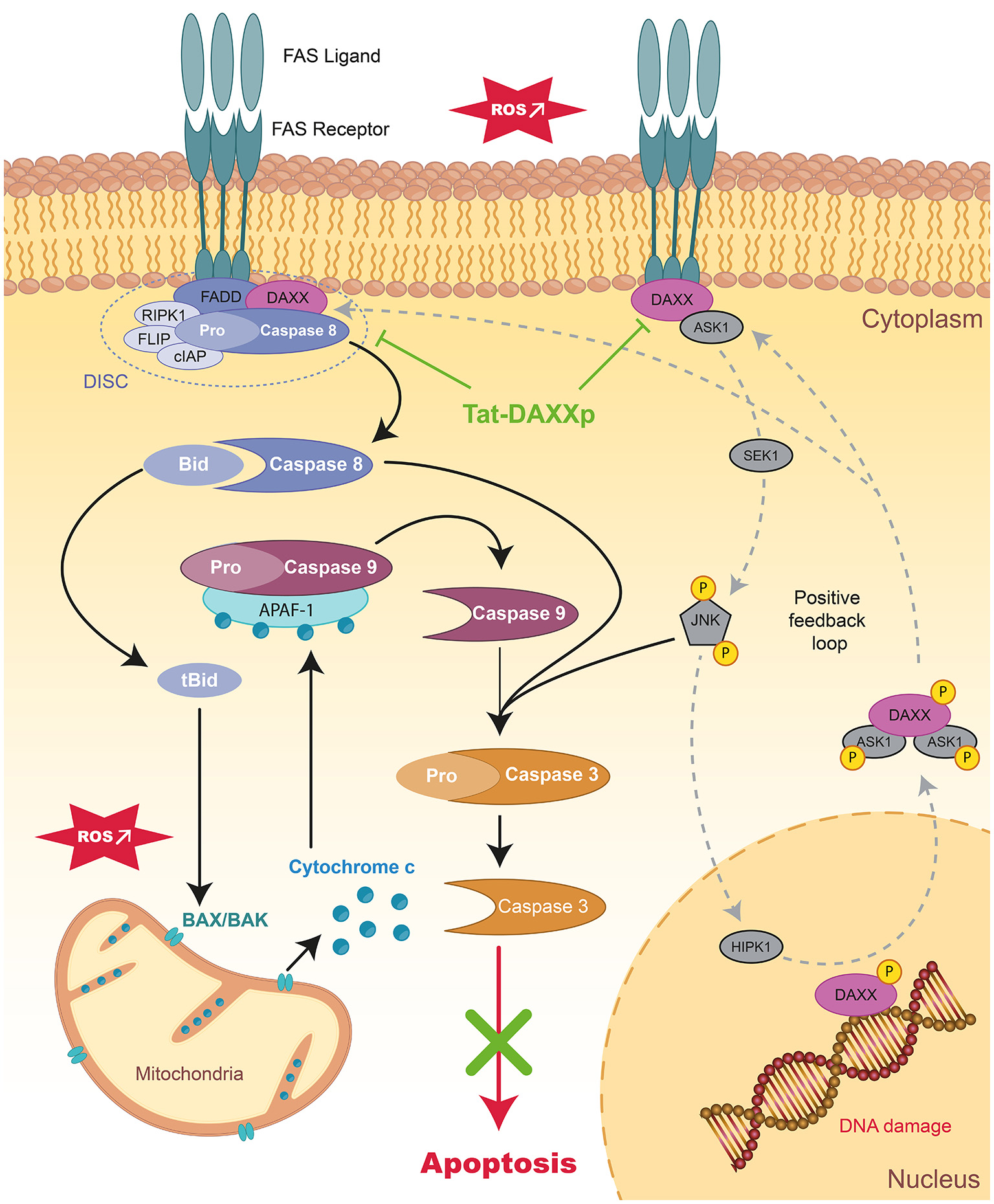 Schematic representation of extrinsic apoptotic pathways and mode of action of therapeutic peptides during MIRI. Schema presenting the signaling apoptotic cascades activated during MIIR involving receptor-dependent pathways in the myocardium. The positive feedback loops regulating DAXX nucleic-cytoplasmic ratio is showed in dark gray. Tat-DAXXp treatment administered at the onset of reperfusion (highlighted in green) can inhibit both the extrinsic and intrinsic pathways. FAS, First Apoptosis Signal; FADD, Fas-Associated protein with Death Domain; DAXX, Death-domain associated protein-6; DISC, death-inducing signaling complex; RIPK1/3, Receptor-interacting serine/threonine-protein kinase 1/3; FLIP, FLICE-inhibitory protein; cIAP, cellular inhibitor of apoptosis proteins 1; ASK1, Apoptosis Signal regulating Kinase 1; JNK, c-Jun N-terminal Kinase; HIPK, homeodomain-interacting protein kinase.