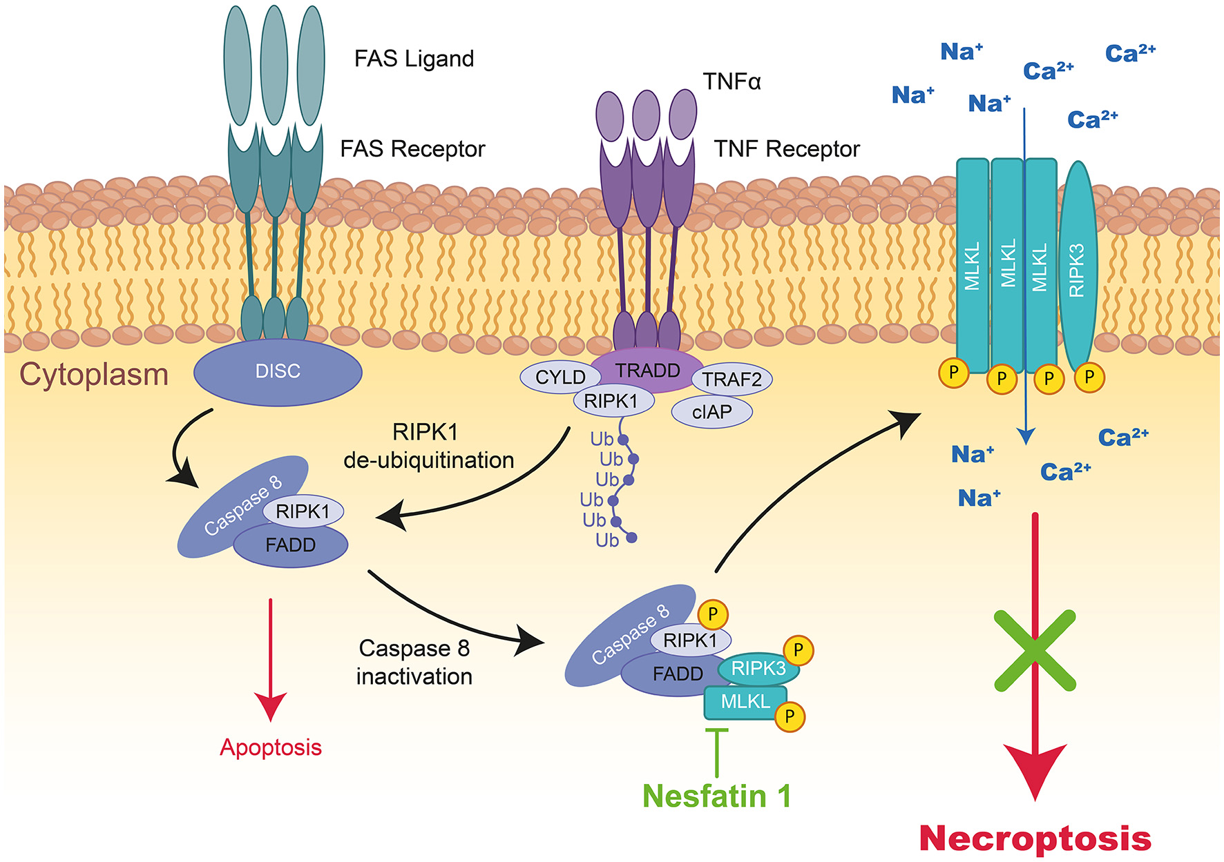 In cardiac pathology, necroptosis has been identified as a lytic form of RCD leading to the release of proinflammatory intracellular molecules (29, 30). Even if necroptosis is morphologically similar to necrosis, this pathway could also depend on Caspase-8 activity and therefor, be pharmacological modulable (i.e., inhibited by necrostatin-1). Necroptosis is triggered by oxidative stress or TNFα (Tumor Necrosis Factor), FasL (FAS Ligand), and TRAIL (TNF-Related Apoptosis-Inducing Ligand) cytokines activating death receptors (Figure 3) (31). Necroptosis is triggered only if Caspase-8, responsible for the cleavage of RIPK1 (Receptor-Interacting serine/threonine-Protein Kinase 1), is inhibited. Phosphorylated RIPK1 and RIPK3 together with MLKL (Mixed Lineage Kinase Domain Like Pseudokinase) form the necrosome leading to phosphorylation and oligomerization of MLKL, which translocates to the plasma membrane to induce membrane rupture (32).