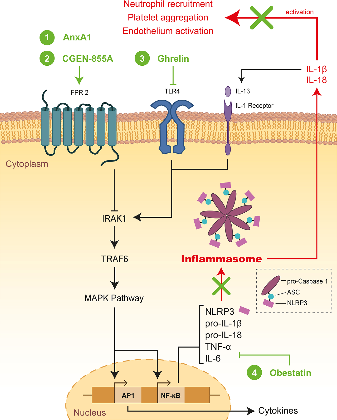 Schematic representation of inflammation and mode of action of therapeutic peptides during MIRI. FPR, TLR4, or IL1 receptors activate the MAPK pathway through IRAK1 and TRAF6. Afterward, the MAPK pathway activates the expression of NLRP3 which formed the inflammasome together with pro Caspase-1 and ASC (Apoptosis-associated speck like protein containing a Caspase recruitment domain) contributing to the strong but short inflammatory burst. Secretion of mature forms of IL-18 and IL-1β activate neutrophil recruitment, platelet aggregation, and endothelium activation. Therapeutic peptides reducing inflammation during MIRI were highlighted in green: (1) AnxA1, (2) CGEN-855A, (3) Ghrelin, and (4) Obestatin. FPR, Formyl peptide receptor; TLR4, Toll-Like Receptor 4; IL1, Interleukin 1; IRAK1, Interleukin 1 Receptor Associated Kinase 1; TRAF6, TNF receptor-associated factor 6; NLRP3, NOD-, LRR- and pyrin domain-containing protein 3.