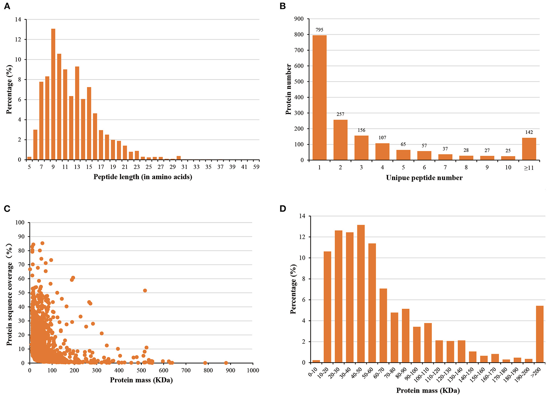 Distribution of (A) peptide lengths, (B) numbers of peptides, (C) protein sequence coverage, and (D) protein mass.