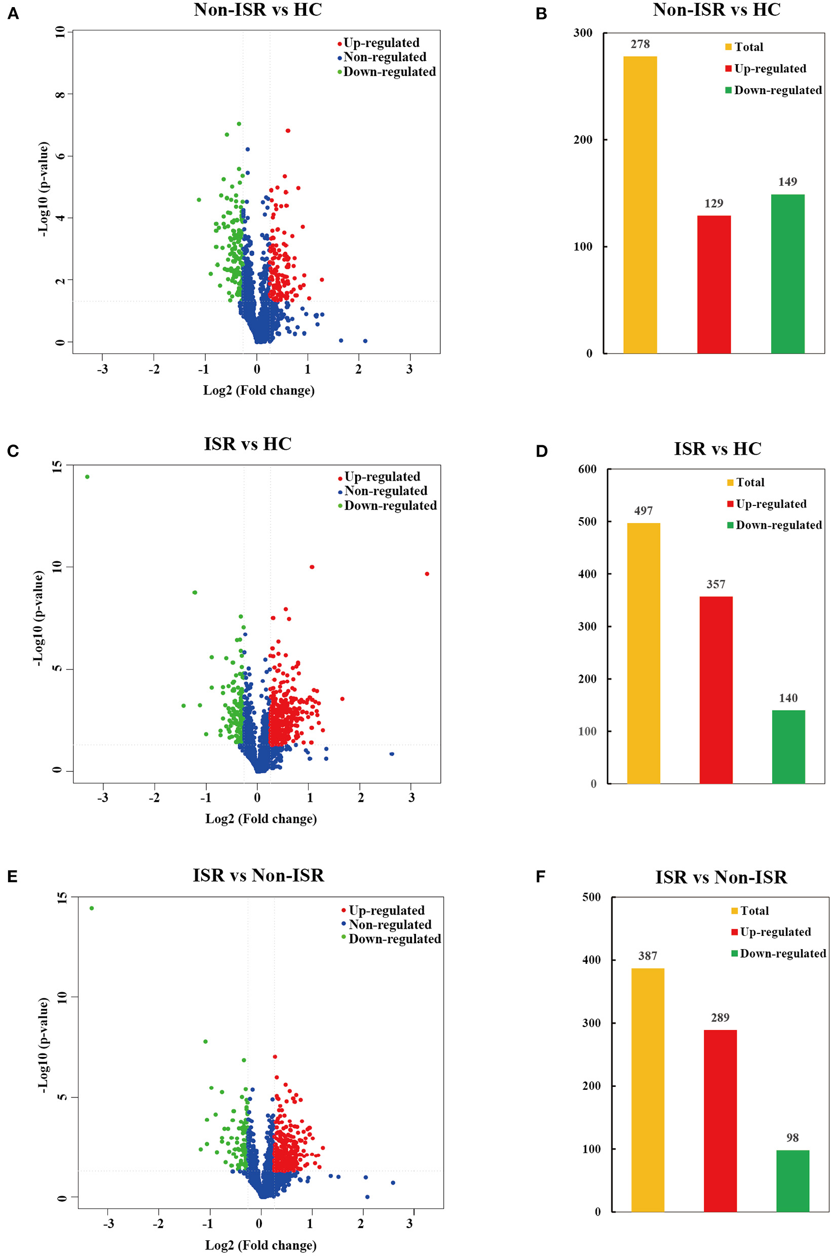 Volcano plots and histogram statistics of differentially abundant proteins between (A,B) non-ISR patients and HCs, (C,D) ISR patients and HCs, or (E,F) ISR and non-ISR patients. Increased abundance proteins are indicated in red (ratio > 1.20), while decreased abundance proteins are indicated in green (ratio < 0.83) with p < 0.05. The x-axis displays the log2 (fold change) for proteins, and the y-axis displays the corresponding log10-transformed p-values.
