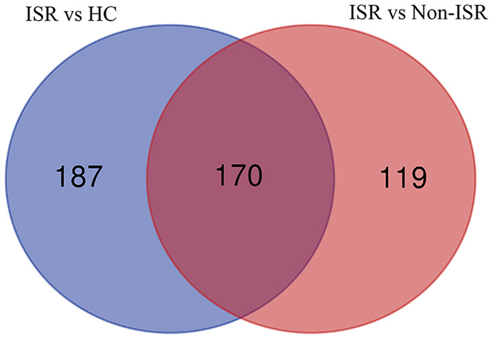 Venn diagram showing the overlap of increased abundance proteins between comparisons of ISR patients with HCs (purple), and of ISR with non-ISR patients (red).