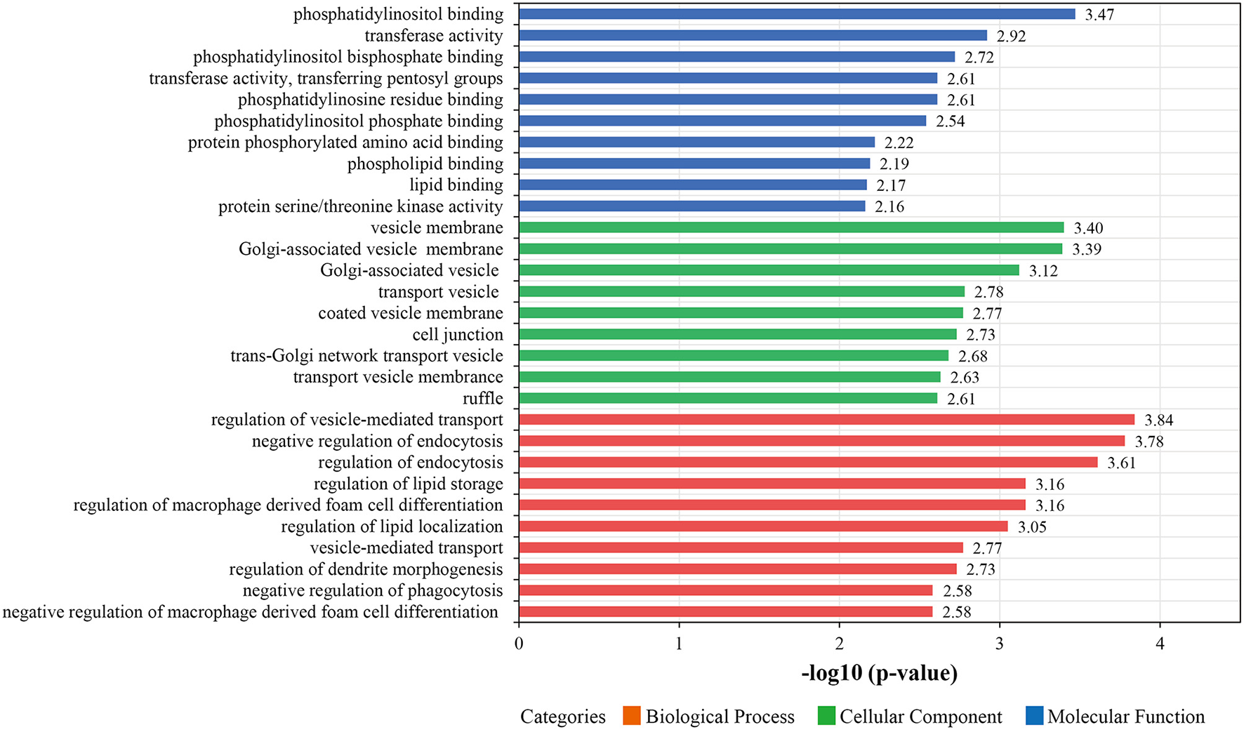 In subsequent analyses, we focused on proteins that were changes in abundance levels during the pathological process of ISR. Based on GO analysis, the 387 with increased or decreased abundance between the ISR and non-ISR groups were categorized in terms of biological processes, cellular components, and molecular functions. The top 10 most enriched molecular functions, cellular components, and biological processes are shown in Figure 5 and Supplementary Table 9. In the classification of molecular functions, the significant top 10 enrichment items are phosphatidylinositol binding, transferase activity, phosphatidylinositol bisphosphate binding, phosphotyrosine residue binding, transferase activity, transferring pentosyl groups, phosphatidylinositol phosphate binding, protein phosphorylated amino acid binding, phospholipid binding, lipid binding and protein serine/threonine kinase activity. In the category of cellular components, the top 10 significant enrichment items are cytoplasmic vesicle membrane, vesicle membrane, Golgi-associated vesicle membrane, Golgi-associated vesicle, transport vesicle, coated vesicle membrane, cell junction, trans-Golgi network transport vesicle, transport vesicle membrane and ruffle. Moreover, regulation of vesicle-mediated transport, negative regulation of endocytosis, regulation of endocytosis, regulation of macrophage derived foam cell differentiation, regulation of lipid storage, regulation of lipid localization, vesicle-mediated transport, regulation of dendrite morphogenesis, negative regulation of macrophage derived foam cell differentiation and negative regulation of phagocytosis were the top 10 significantly rich terms in the biological processes.