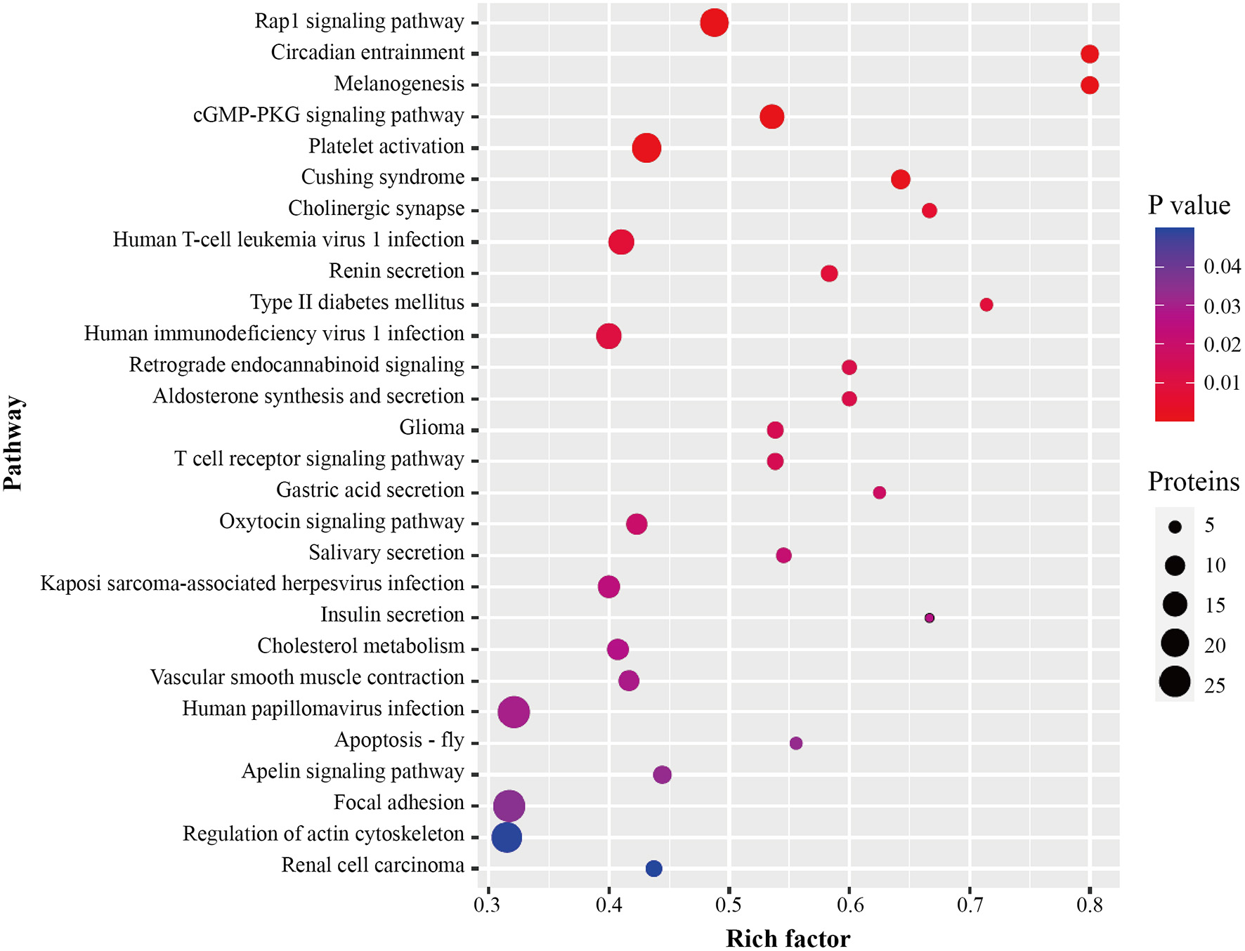 After identification of plasma proteins significantly altered between the ISR and non-ISR groups, a KEGG pathway analysis was performed to investigate their potential biological functions. The dysregulated proteins mapped mainly onto 28 KEGG pathways (Figure 6; Supplementary Table 10). A total of 371 pathway proteins were enriched in the KEGG pathway enrichment analysis. Noteworthy, several of those pathways may be involved in the development of ISR: Rap1 signaling pathway, cGMP-PKG signaling pathway, platelet activation, T cell receptor signaling pathway, cholesterol metabolism, vascular smooth muscle contraction, focal adhesion, and regulation of actin cytoskeleton.
