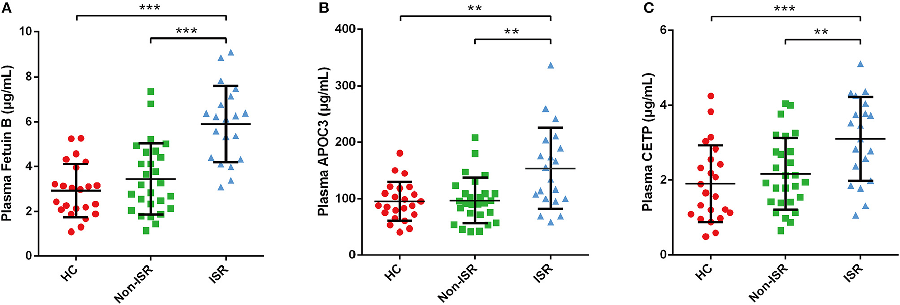 To validate findings from the TMT-based proteomic profiling, three differentially abundant proteins among the HC, non-ISR, and ISR groups were selected and assayed by ELISA. ELISA kits for plasma fetuin-B and apolipoprotein C-III (APOC3) were purchased from Abcam (Cambridge, UK), while a kit for cholesteryl ester transfer protein (CETP) was purchased from Cusabio Biotech (Wuhan, China). Plasma protein levels were measured according to the manufacturers' protocols. The optical density at 450 nm was measured using a Varioskan Flash ELISA reader (Thermo Fisher Scientific, San Jose, CA, USA).