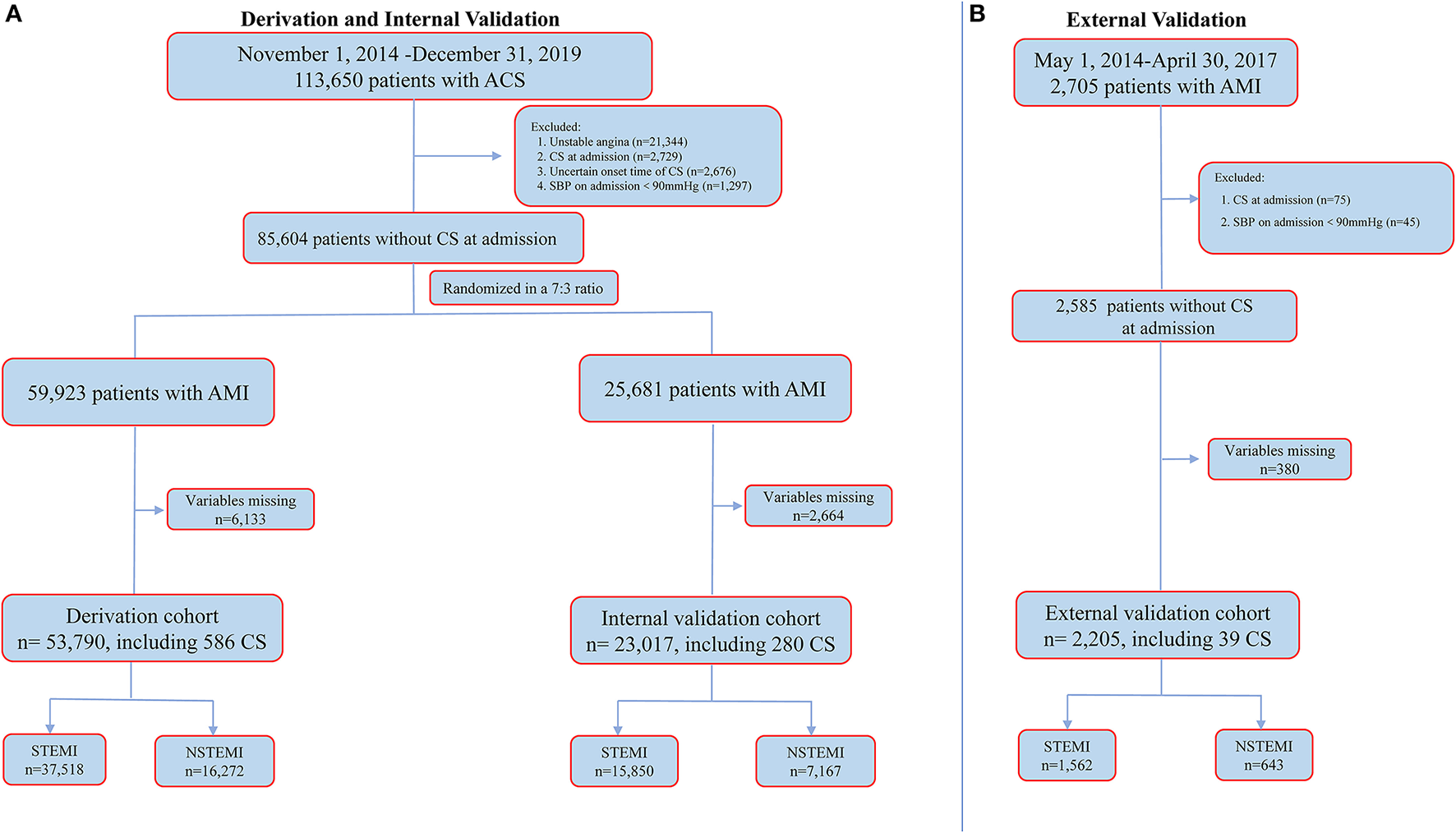 Cohort selection for the main analysis. (A) for CCC-ACS registry and (B) for external validation dataset. ACS, acute coronary syndrome; AMI, acute myocardial infarction; CS, cardiogenic shock; NSTEMI, non-ST-segment elevation myocardial infarction; SBP, systolic blood pressure; STEMI, ST-segment elevation myocardial infarction.