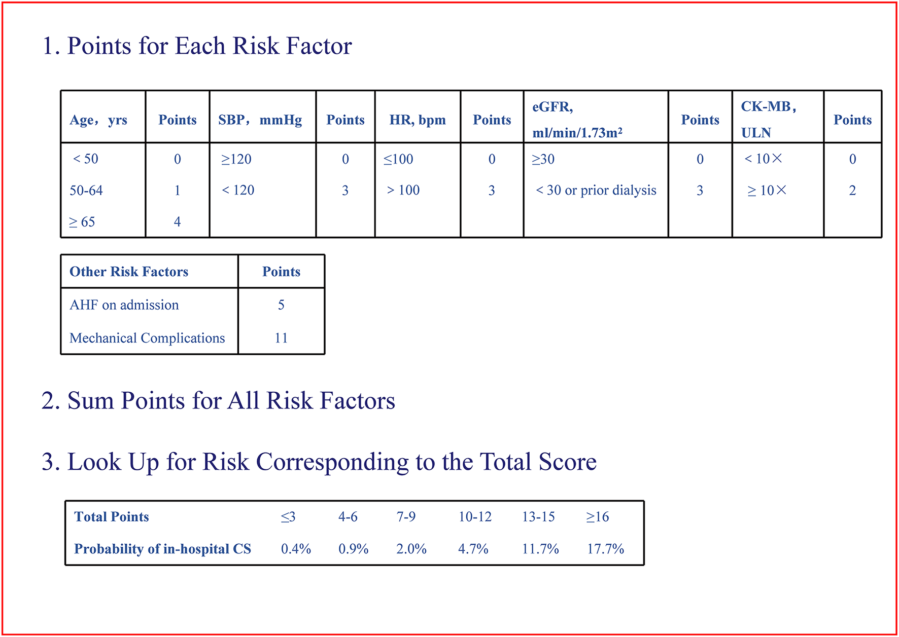 - Based on the data from a large published real-world cohort of patients with AMI, the new Improving Care for Cardiovascular Disease in China–Acute Coronary Syndrome (CCC–ACS) CS risk score was derived and validated with fewer variables compared with previous risk scores.