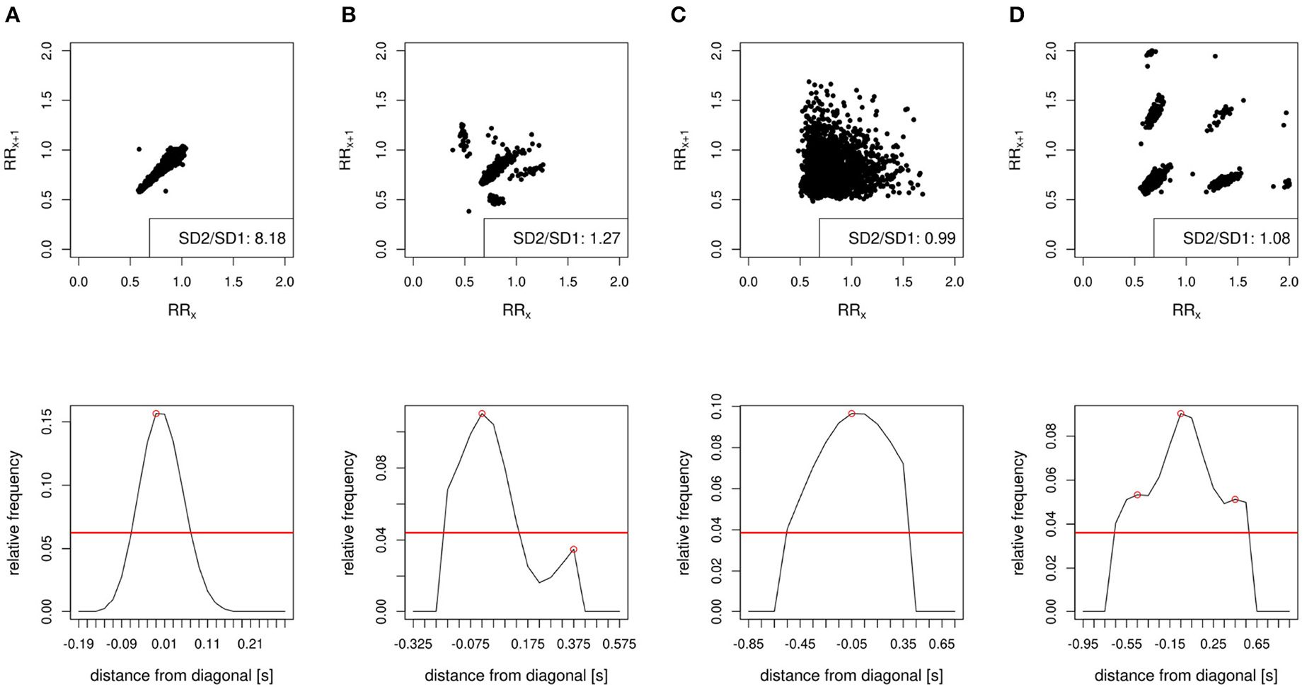 Lorenz plot patterns and their corresponding smoothed histograms of SD1. The plots show 30-min chunks of different measurements that were used in the analysis as an example of different Lorenz plot patterns. The Poincaré plots in the top show a (A) comet, (B) side lobe pattern, (C) fan pattern, and (D) island pattern. The corresponding plots below show the histograms after smoothing. The lobe, fan, and island patterns have an SD2/SD1 ratio of less than 1.5 and would, therefore, be excluded. The histogram of the island patterns includes more than one local maximum, which is another criterion for exclusion. Data: (A)nsr008 from NSR2DB, (B)nsr018 from NSR2DB, (C)01 from LTAFDB, and (D)f018 from CRISDB.