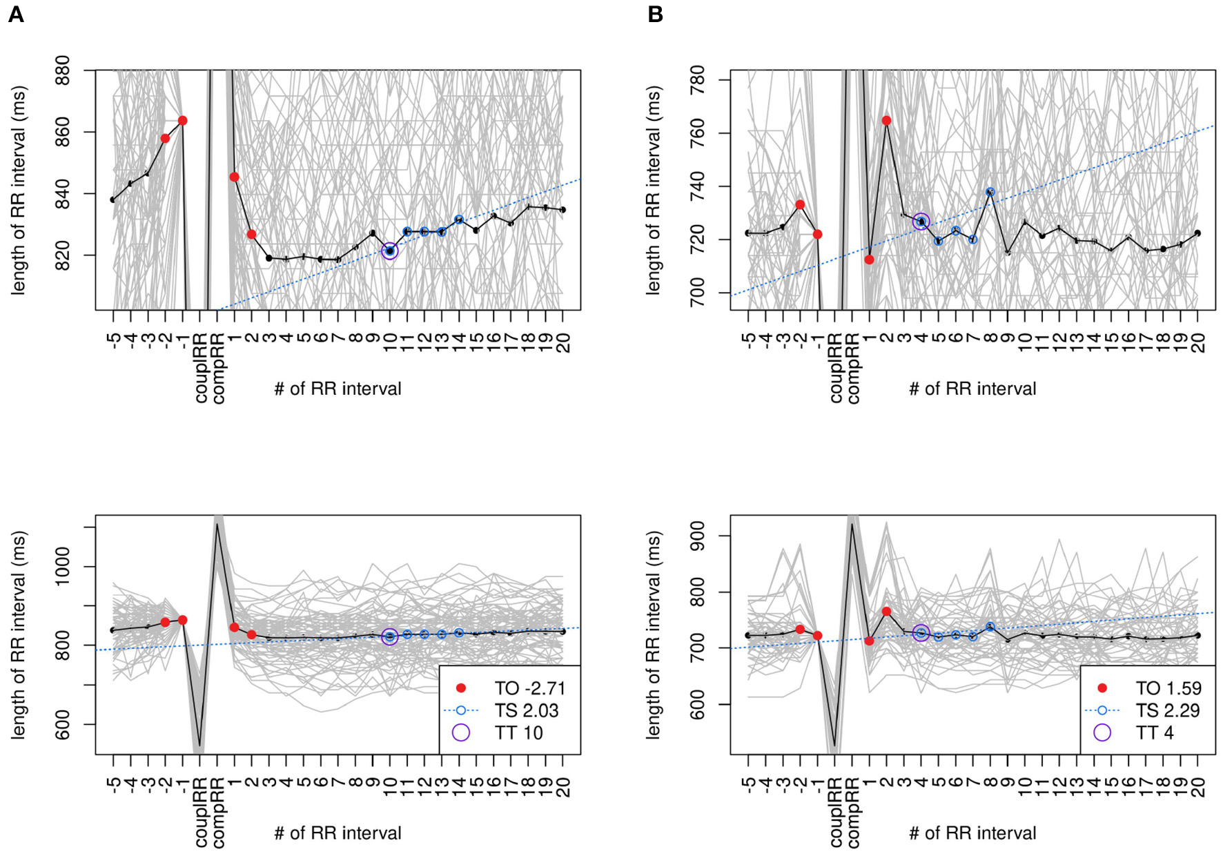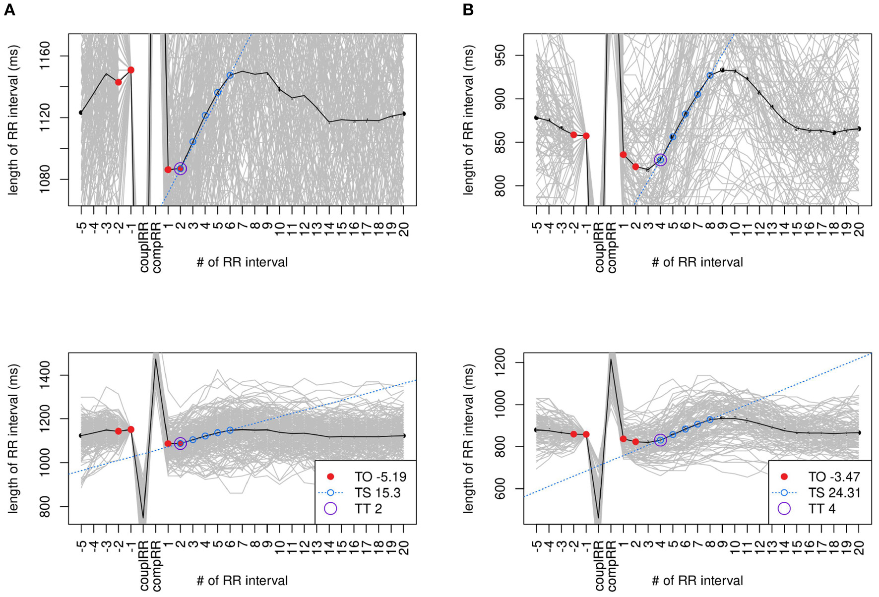 For HRT, there are three main parameter values that can be calculated (check the Supplementary Figure 1 for a graphical depiction): turbulence onset (TO) describes the first drop of the IL after the VPC compared to the intervals before the VPC. It is, therefore, a marker for the parasympathetic response. TS describes the steepest slope of the tachogram after the compensatory interval (compI). The third parameter TT is the index of the first interval that shows TS (4). Both TS and TT are markers for the sympathetic and parasympathetic activity.