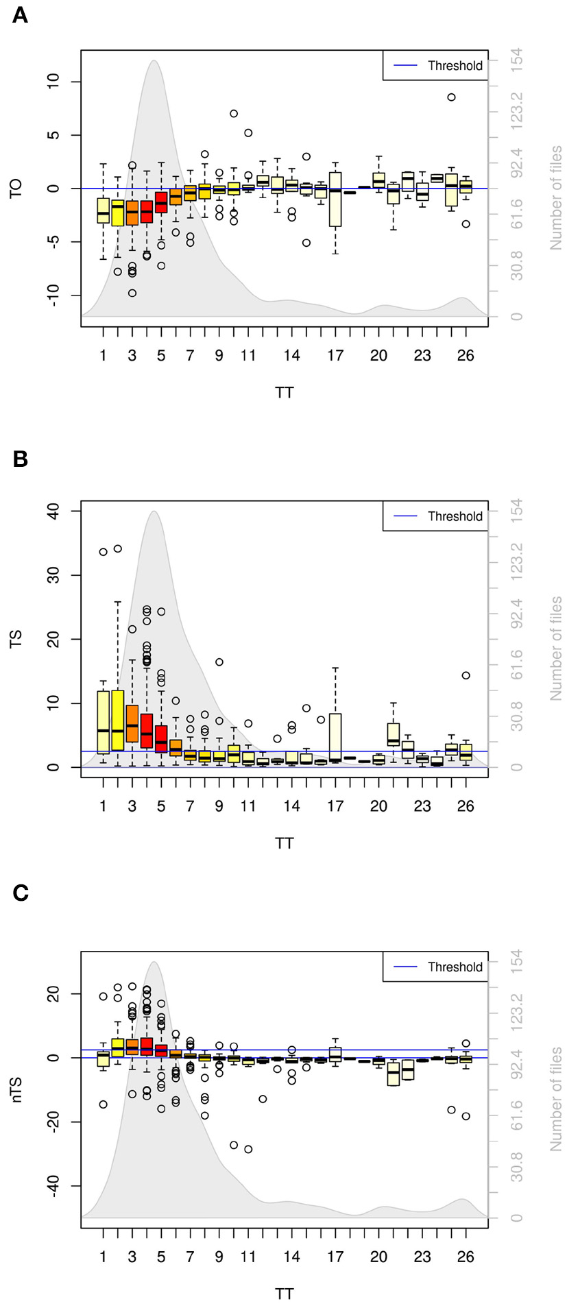 Since HRT is triggered by a VPC via the baroreflex, it is plausible that the reaction should arise without any delay. This means that the slope that represents the turbulence should arise first in direct proximity to the compI and second always after a similar time period. Accordingly, TS calculated from either only late intervals or intervals with widely differing indices may only describe random fluctuation rather than a reaction of the ANS. Because TT describes the localization of TS, it can be used to test this assumption.