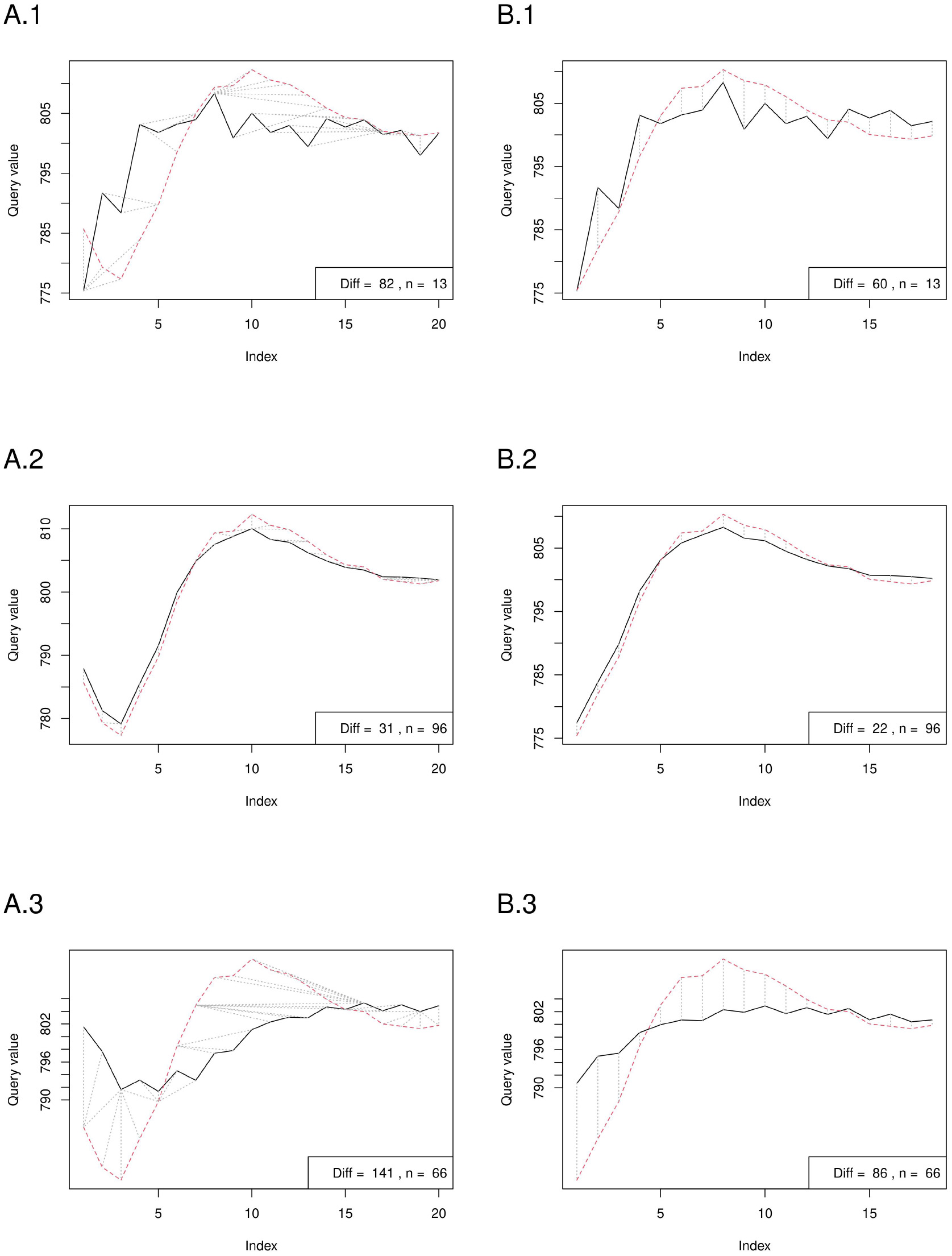 We extracted the RR intervals in a VPCS following the compI (postRRs) of every averaged VPCS, grouped them based on their respective TT, and calculated an averaged postRRs sequence for every TT. For the next step of matching the postRRs of the stVPCS to every averaged postRRs sequence via DTW, we tested two methods: First, we matched the standard sequence dynamically to the averaged sequences with the default step pattern “symmetric2” of the dtw function. Second, we removed the leading intervals of the standard sequence before the TT to receive a sequence that only consists of the intervals that shape the TS and all following intervals. The averaged sequences were cut accordingly and shortened to fit the standard sequence. The standard sequence was matched to all averaged sequences index by index with the dtw step pattern rigid.