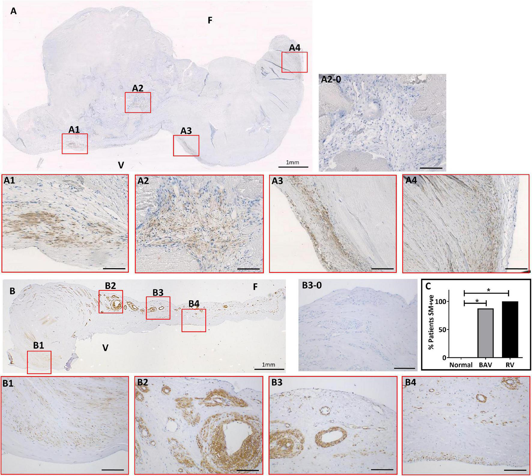 The expression of smooth muscle (SM) markers in a bicuspid aortic valve (BAV) (A) and a rheumatic heart valve (RHV) cusps (B). Expanded panels in red boxes show staining patterns from consecutive sections with negative control (A2-0), SM22 (A1), α-SMA (A2), calponin (A3), and SM-myosin (A4). Expanded panels in red boxes show staining patterns from consecutive sections of B with negative control (B3-0), SM22 (B1), α-SMA (B2), calponin (B3), and SM-myosin (A4). Panel (C) shows graph showing the incidence of aberrant SM +ve staining in BAV and RHV cusps. F and V represent fibrosal and ventricularis side, respectively. Scale bar in expanded panels represents 200 μm. *p < 0.005.