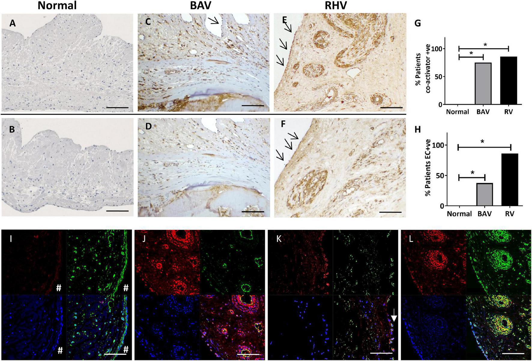 The expression of co-activators myocardin (A,C,E) and MRTF-A (B,D,F) in normal, BAV and RHV cusps. Graph showing the incidence of BAV and RHD cusps positive for aberrant co-activator expression (G) and aberrant expression of co-activators in valve endothelial cells (VECs) (H). Panels (I–L) show colocalization of markers in bottom right panels. No expression of myocardin (red) in a normal cusp in VICs or VECs (#), vimentin (green) present in both cell types (I). RHV valve showing myocardin (red) in the endothelial cells and SM cells of their vasculature, (CD31, green) of the vessels and colocalisation in endothelial cells (J). Some surface VECs of a BAV showing co-expression of myocardin (red) with CD31 (green) (K). RHV showing myocardin (red) and SM-MHC (green) in SM of vasculature and some VICs (left side of vessels) (L). Blue is DAPI staining. Scale bar represents 200 μm. *p < 0.001.