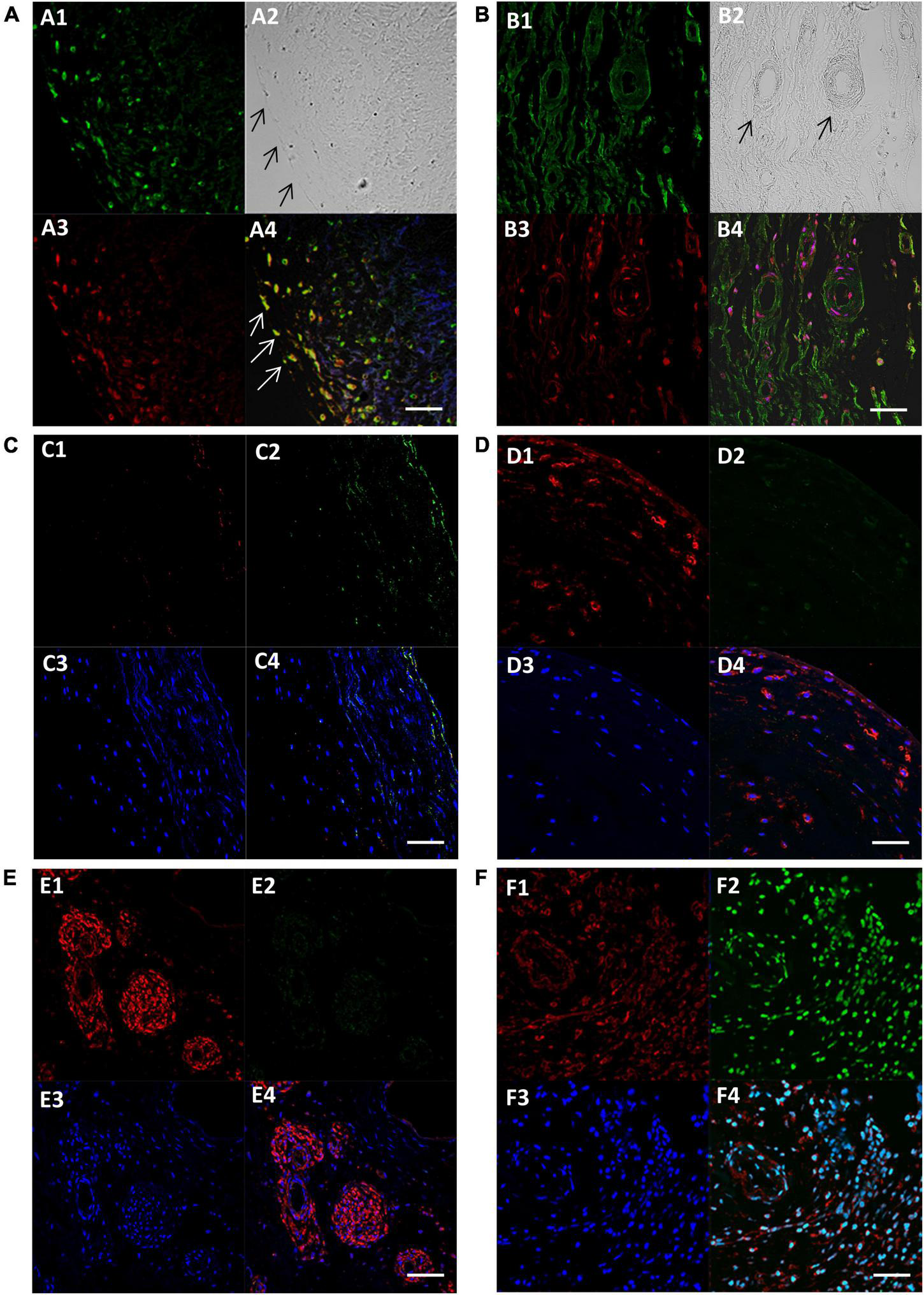 We questioned whether the VECs that expressed SM markers also co-expressed markers of calcification. We observed that some VECs at the surface and just under the surface of 5 BAVs were able to co-express SM markers and Runx2 (Figures 3A1–4). Four RHVs showed more co-expression of SM and Runx2 in VECs of the neovessels than the cusp surfaces (Figures 3B1–4).