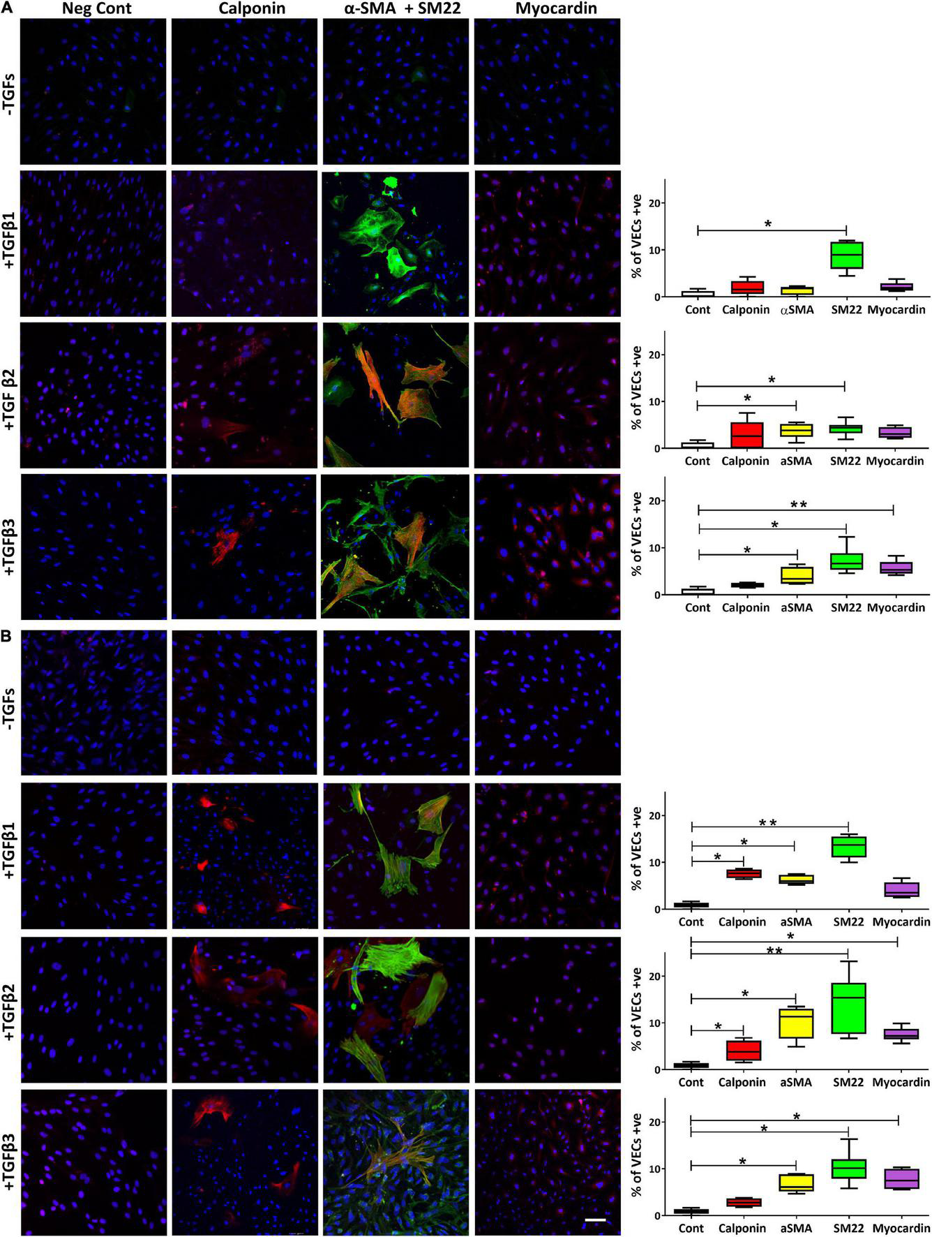 However, when VECs were cultured on fibronectin, TGFβ1 was able to significantly increase calponin (p < 0.05), α-SMA (p < 0.05) and SM22 (p < 0.01); TGFβ2 was able to significantly increase calponin (p < 0.05), αSMA (p < 0.05), SM22 (p < 0.01) and myocardin (p < 0.05); TGFβ3 was able to significantly increase αSMA (p < 0.05) and SM22 (p < 0.05) and myocardin (p < 0.05; Figure 5B).