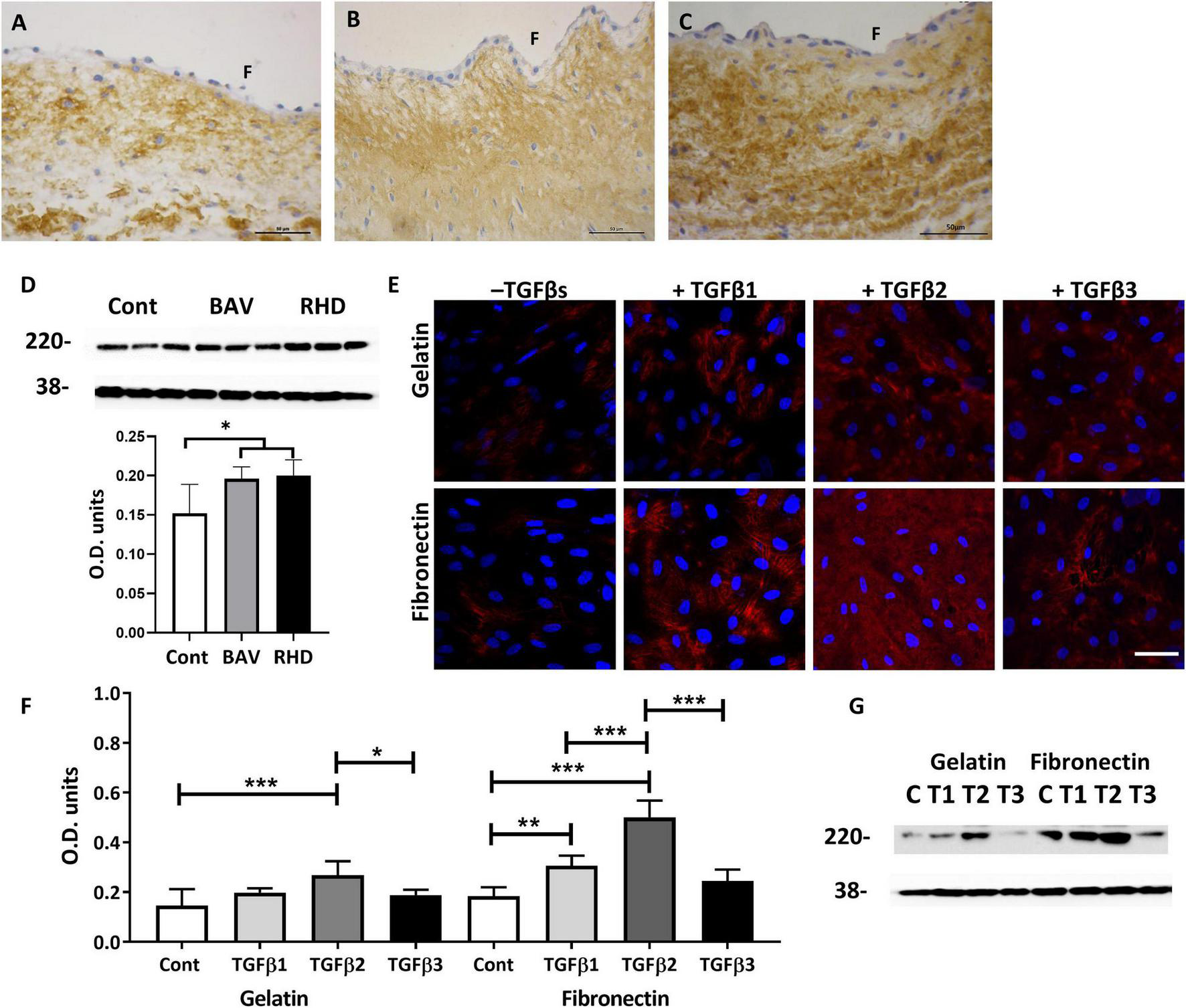 The expression of fibronectin on a normal (A) BAV, (B) RHV, (C) cusp, and quantitative levels (D). The expression of fibronectin by VECs plated on gelatin (top panel) and on fibronectin (bottom panel) and treated with TGFs (E). Graph showing the level of expression of fibronectin by VECs when plated on gelatin or fibronectin and treated with TGFs (F) and the corresponding Western blot showing levels of fibronectin at 220 kD and the housekeeping protein GAPDH at 38 kD (G). Panel (F) represents the fibrosal side. Scale bar in panel (A–C) is 50 μm, in panel (D) is 100 μm. *p,0.05, **p < 0.01, ***p < 0.001.