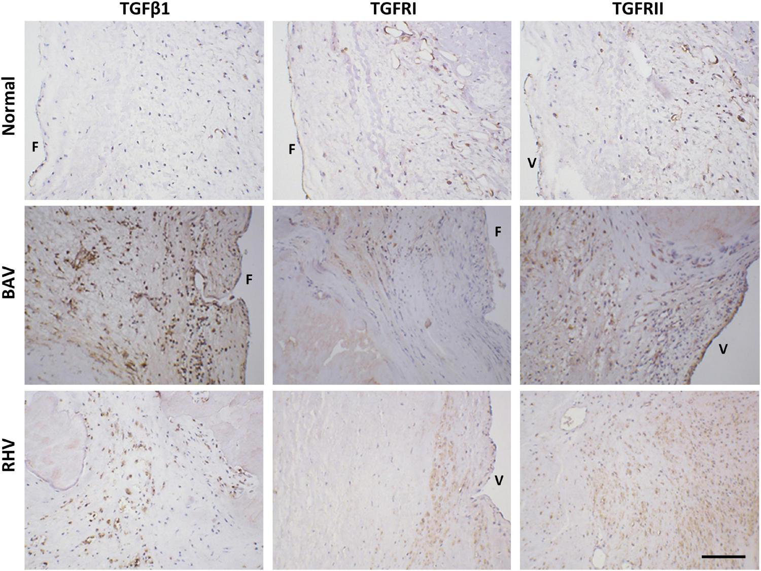 The expression of transforming growth factor β1 (TGFβ1), TGFR1, and TGFRII in normal, BAV and RHV cusps. F and V represent the fibrosal and ventricularis side, respectively. Scale bar is 200 μm.