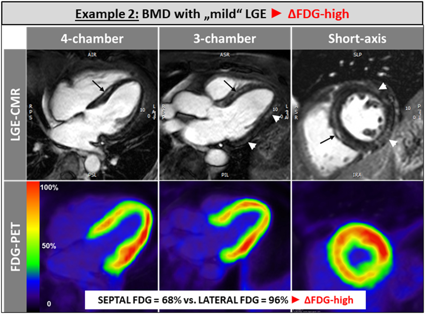To the best of our knowledge, this is the first clinical study that uses simultaneous PET-CMR imaging in patients with BMD in order to assess both metabolic (FDG-PET) and structural myocardial changes (LGE-CMR) at the same time in the same cardiac regions. Based on the presented preliminary data, we hypothesize that (a) segmental FDG uptake (reflecting myocardial metabolic activity) is higher in the LV lateral free wall (compared to the septal wall) of BMD patients possibly due to a higher segmental work load, however, only as long as myocardial scarring is limited, and (b) extensive and ongoing myocardial scarring in the LV free wall results in equalization of lateral vs. septal wall FDG uptake by a “relative” decrease in lateral wall FDG uptake due to a decreasing number of “viable” cardiomyocytes whilst growing scars in this region.
