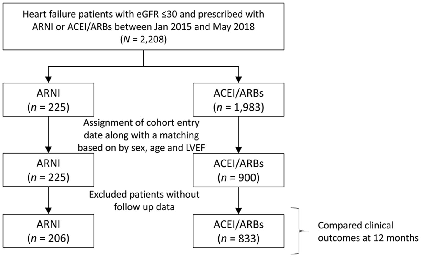 HFrEF patients who had been prescribed an ARNI, ACEI, or ARB (candesartan, valsartan, losartan, or a fixed-dose combinations including these three ARBs) for at least 30 days were further identified. The date of the first prescription of an ARNI was defined as the cohort entry date for the ARNI group. The cohort entry date for the ACEI/ARB group was assigned from the ARNI group to avoid immortal time bias (9). In the meanwhile, the two groups were frequency matched based on age, sex, and baseline LVEF. The baseline period was defined as the 12 months before the cohort entry date. We excluded those who had no serum creatinine data and those with an eGFR > 30 mL/min/1.73 m2. Patients without follow-up data were also excluded.