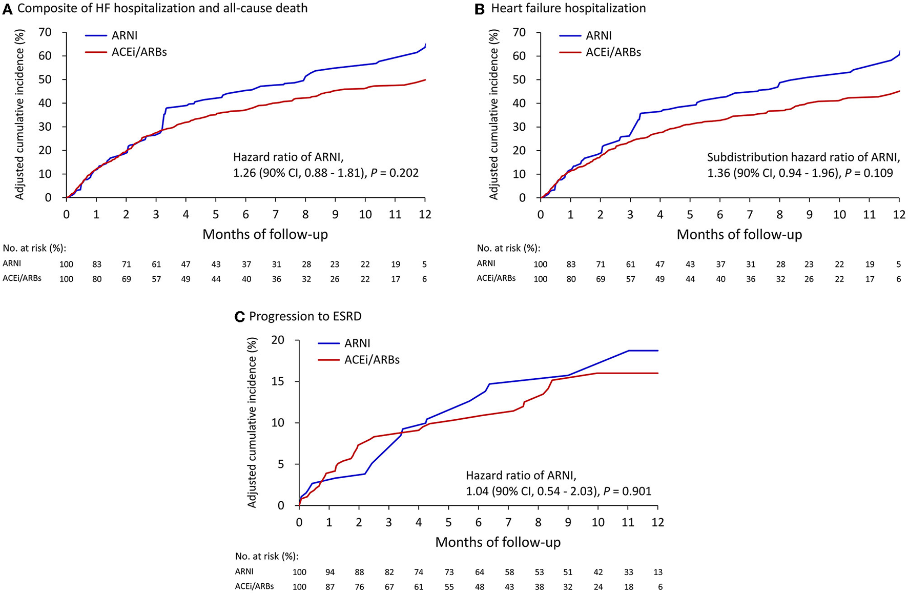 There are several limitations to the present study, First, number of the patients in the ARNI group was small and the follow-up period was short. Second, this was a retrospective observational study. Although we used IPTW to adjust for important outcome-related baseline characteristics, unmeasured confounders may still have been present (including functional class, duration of heart failure, etiology of CKD and HFrEF). Third, missing laboratory data at baseline (such as B-type natriuretic peptide) and the need to input missing values is not uncommon in real-world data and should be acknowledged as another limitation. Clinical events that occurred outside CGMHs were not recorded in the CGRD, which may have led to underestimation of the actual event rates. Forth, this study was conducted using an on-treatment design and did not adjust for temporal changes in medical condition during the follow-up period. Finally, the present study only enrolled Asian patients, and whether our results can be extrapolated to patients of other ethnicities remains unclear.