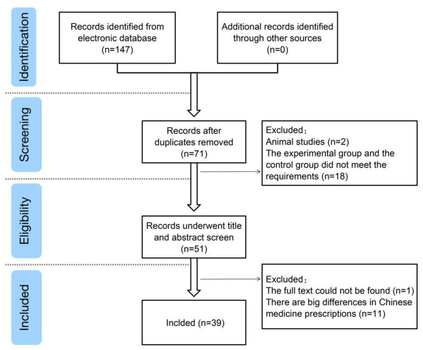 A total of 147 studies were retrieved from the search results, and 39 studies (6–44) were included after reading abstracts and full texts. Exclusions comprised duplicate studies, case reports, reviews, retrospective studies, non-randomized controlled trials, and inconsistent trial bases (Figure 1).