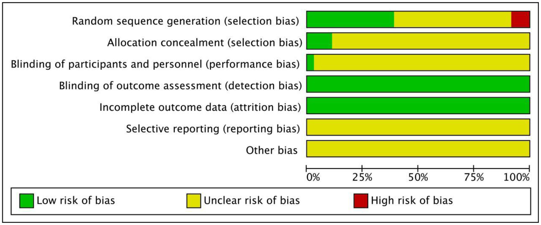 The methodology quality evaluation of the included studies was performed using the “bias risk assessment” tool recommended by Cochrane Handbook 5.0. The quality of the included studies was evaluated in terms of the random allocation method, allocation concealment, blinding method, integrity of the results data, and selective reporting of bias of the research results. We selectively reported the bias of the research results and other aspects of quality evaluation. For each study, the above items were evaluated as “yes” (low bias), “no” (highly biased), or “unclear” (lack of relevant information or uncertainty of bias).