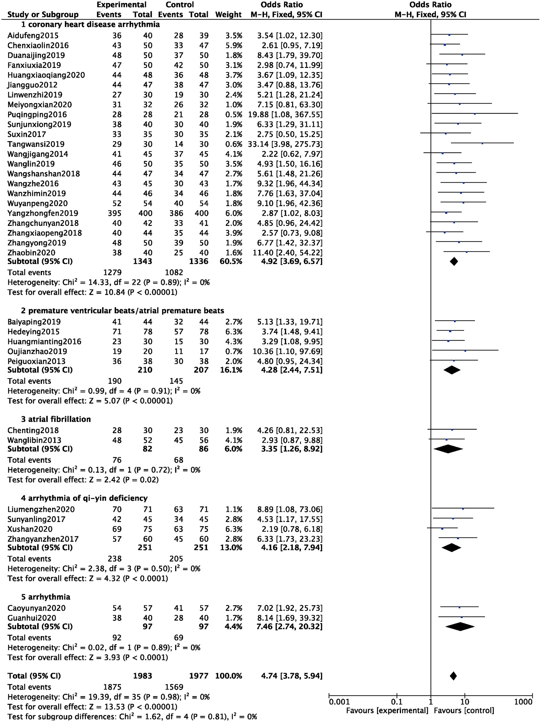 Outcome indicator: ① Total Efficacy ② Incidences of arrhythmia ③ Adverse Events ④ TCM Syndrome Score ⑤ HR of Arrhythmia.