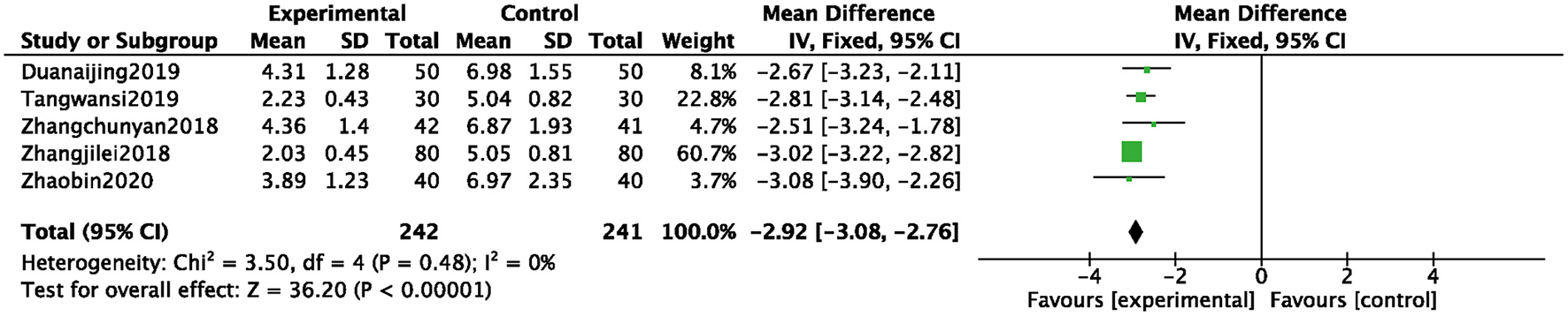 RevMan 5.3 software, provided by the Cochrane collaboration network, was used in the analysis. The two classification variables used OR as the curative effect analysis statistics, and the numerical variables used the mean difference (MD) as the curative effect analysis statistics. Each effect was expressed as a 95% confidence interval (CI). The chi-square test was used to analyze heterogeneity among the studies. When there was a high degree of statistical heterogeneity among the studies (P < 0.1, I2 > 50%), the random effects model was used; otherwise, the fixed effect model was used.
