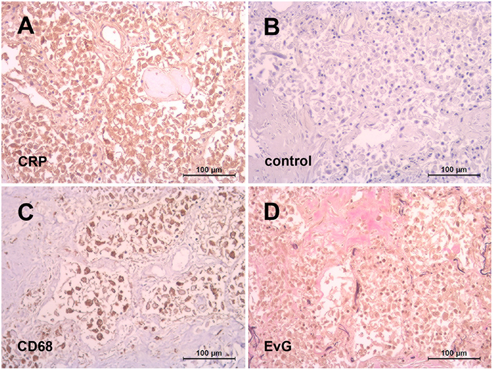 Besides is importance as a prognostic factor of severity and mortality (62), an obviously harmful effect of CRP was unmask by the recent COVID-19 pandemic insofar as individual patients were treated successfully by selective CRP apheresis (56, 57). The rationale behind was that SARS-CoV-2 infection initiated an unhalted autoimmune response by CRP going along with macrophage and complement activation suspected to be responsible for pulmonary fibrosis and subsequent organ failure in COVID-19. This assumption might be illustrated by our preliminary observation of an abundant CRP expression in the lung of patients died of COVID-19 (Figure 1). The latter should be considered in particular with respect to the recently described immunological profiles of COVID-19 lungs (63) suggesting a complex interplay of innate and adaptive immunity underlying the clinical picture. It has to be emphasized, however, that other anti-inflammatory treatment options, for example blocking interleukin-6 or inhibiting the C3 and C5 activation also showed a promising preclinical effect (64).