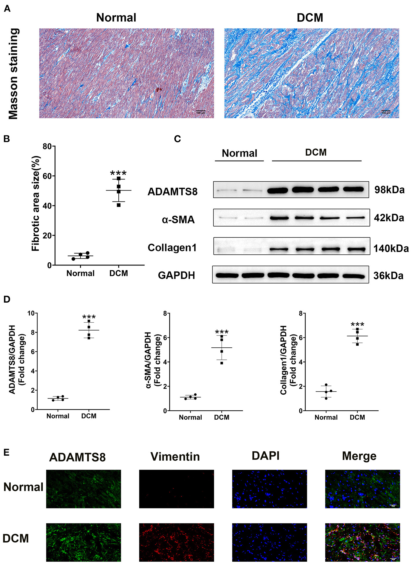 ADAMTS8 expression was increased in DCM patients with severe cardiac fibrosis. (A,B) Representative Masson staining (scale bar = 100 μm) and quantification of fibrosis. (C,D) Representative western blotting and quantification of ADAMTS8, α-SMA, and Collagen1 expression in the ventricular septum from hearts obtained from patients with DCM and normal hearts. (E) Immunofluorescence staining of ADAMTS8 and Vimentin in the ventricular septum from hearts from patients with DCM and normal hearts (scale bar = 40 μm). Data were presented as mean ± SEM. ***P < 0.001 vs. Normal group.