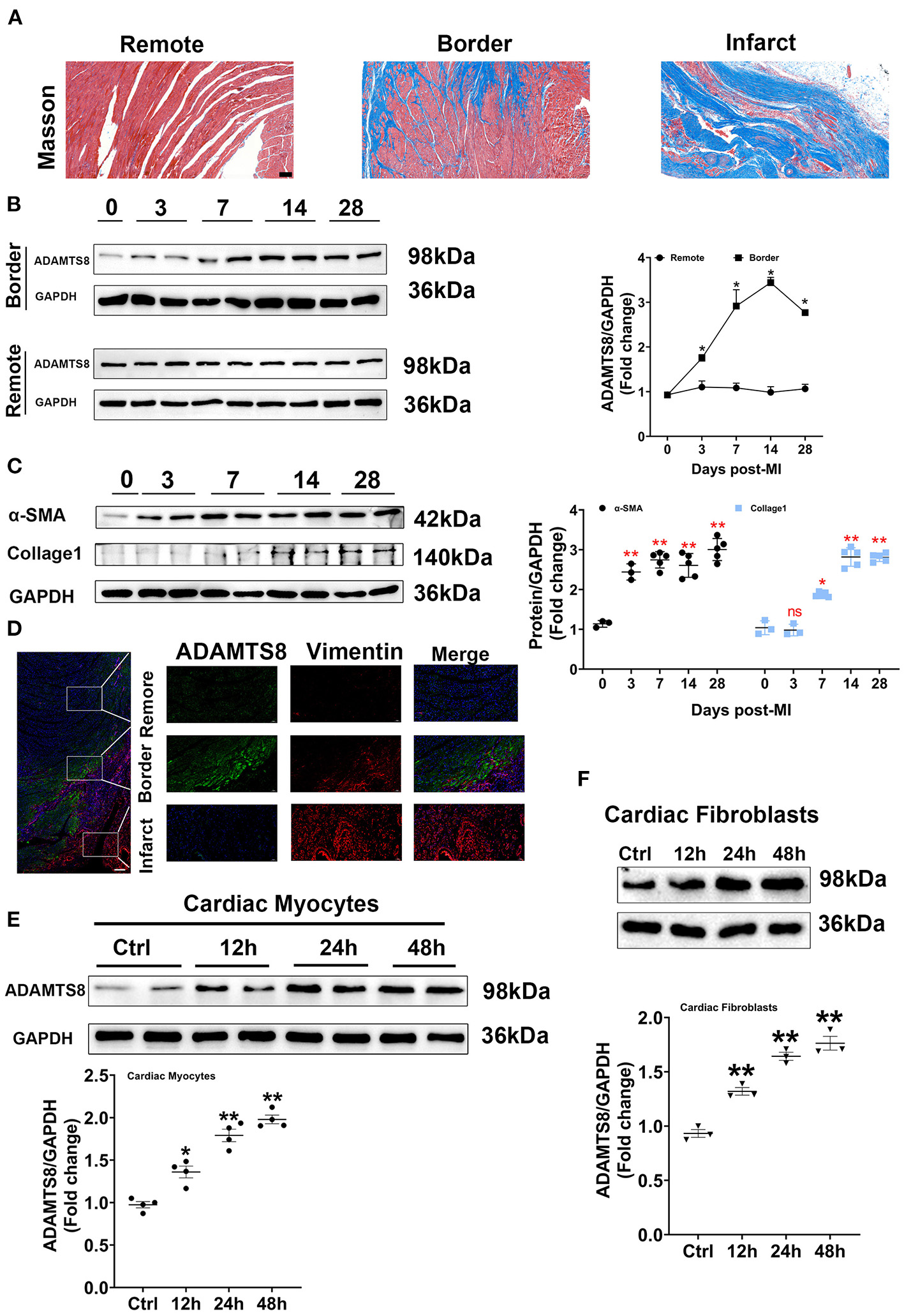 ADAMTS8 overexpression in MI rats impaired cardiac function and promoted myocardial fibrosis at 28 days post-MI in vivo. In vitro studies revealed that overexpression of ADAMTS8 promoted cardiac fibroblast transition into myofibroblasts and induced cardiac fibroblast proliferation, migration and collagen synthesis. Therefore, the combined findings in vivo and in vitro indicated that the ADAMTS8 overexpression in the infarct boundary zone after myocardial infarction was one of the reasons for CFs enhancement, which lead to cardiac dysfunction and remodeling after myocardial infarction. Thus, targeting ADAMTS8 might be a potential treatment for cardiac fibrosis.