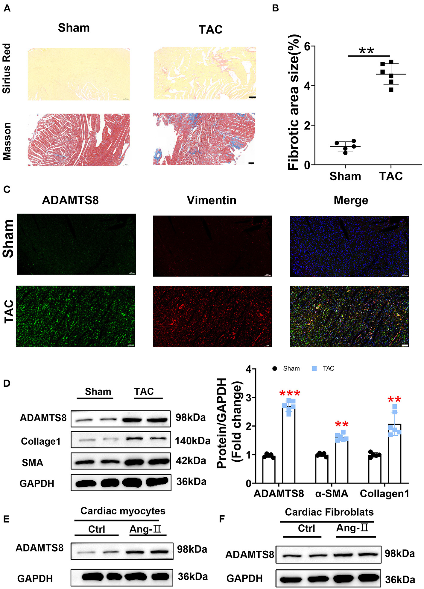ADAMTS8 expression was increased in the TAC-induced cardiac fibrosis rat model. (A,B) Representative Sirius Red and Masson staining images from a sham heart and a TAC-induced heart (scale bar = 200 μm). (C) Immunofluorescence staining of ADAMTS8 (green) and vimentin (red) in normal and TAC-induced rats (scale bar = 100 μm). (D) ADAMTS8, α-SMA, and Collagen1 expressions in the sham group and TAC model group via western blotting and quantified according to the immunoblots. (E,F) The ADAMTS8 protein level in cardiac myocytes and cardiac fibroblasts treated with PBS or Ang-II. Data were presented as mean ± SEM. **P < 0.01, ***P < 0.001 vs. sham.