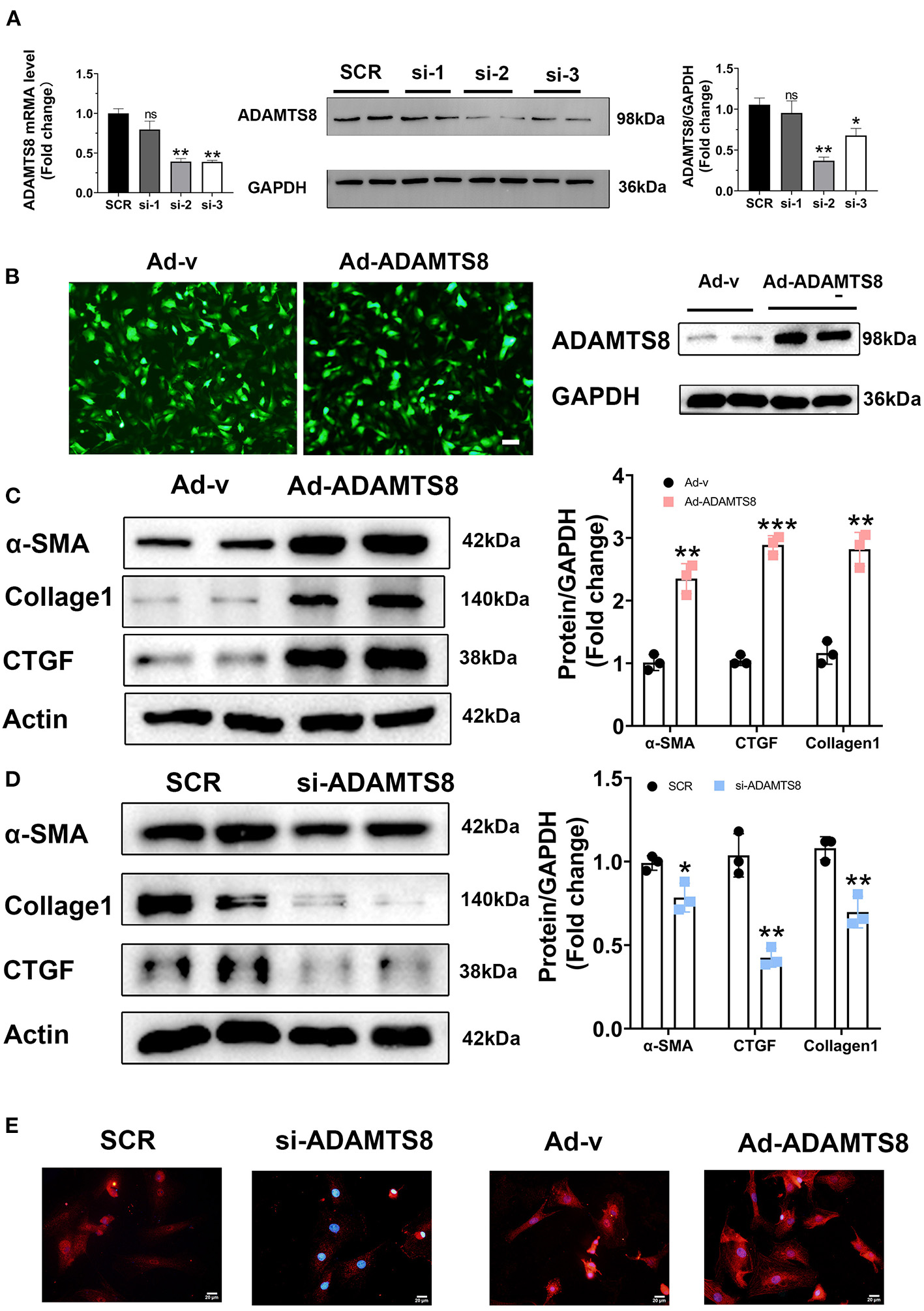 ADAMTS8 promoted myofibroblast formation in vitro. (A) Knockdown efficiency of three different interference sequences of ADAMTS8 detected by qPCR and western blotting. (B) The overexpression efficiency of ADAMTS8 verified by fluorescence and Western blotting. (C,D) α-SMA, Collagen I, and CTGF levels in cultured cardiac fibroblasts infected with ADAMTS8-overexpressing adenovirus or si-ADAMTS8 detected via western blotting. (E) Immunofluorescence for the expression of α-SMA (red) and nuclei (DAPI: blue) (scale bar = 20 μm). Data were presented as mean ± SEM. *P < 0.05, **P < 0.01, ***P < 0.001, and NS indicates no significance vs. Ctrl or between the two indicated groups.