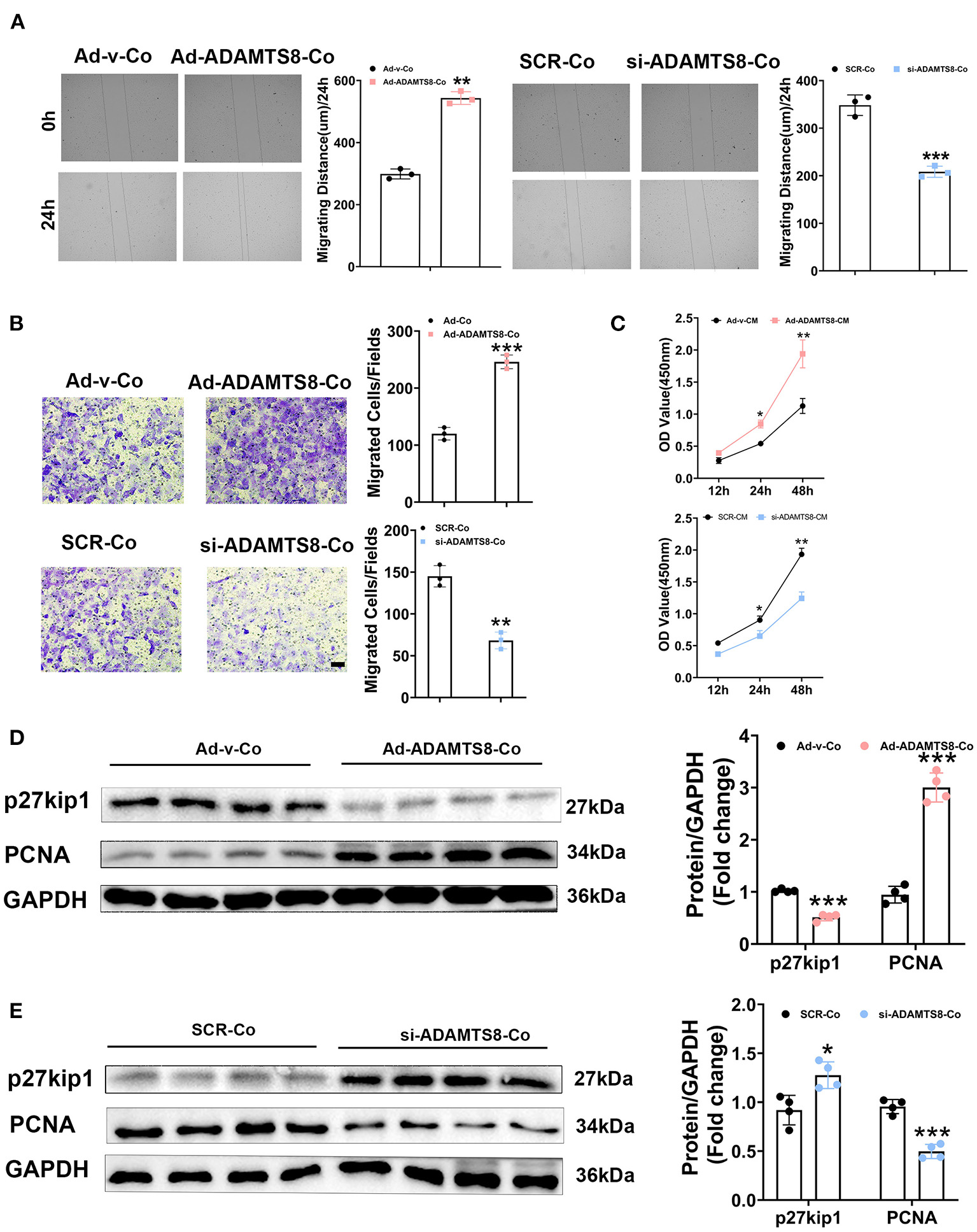 ADAMTS8 mediated the interaction between cardiomyocytes and cardiac fibroblasts. (A) Wound repair assays to assess the migration ability of cardiac fibroblasts co-cultured with cardiomyocytes transfected with ADAMTS8 overexpressing adenovirus (Ad-ADAMTS8-Co) or siRNA (si-ADAMTS8-Co). (B) Transwell migration assay and quantification of migrated cardiac fibroblasts (scale bar = 50 μm). (C) Quantification by CCK-8 assay (n = 4 in each group). (D,E) p27kip1 and PCNA levels in cardiac fibroblasts co-cultured with cardiomyocytes transfected with ADAMTS8 overexpressing adenovirus (Ad-ADAMTS8-Co) or siRNA (si-ADAMTS8-Co) detected via western blotting. Data were presented as mean ± SEM. *P < 0.05, **P < 0.01, and ***P < 0.001 between the two indicated groups.