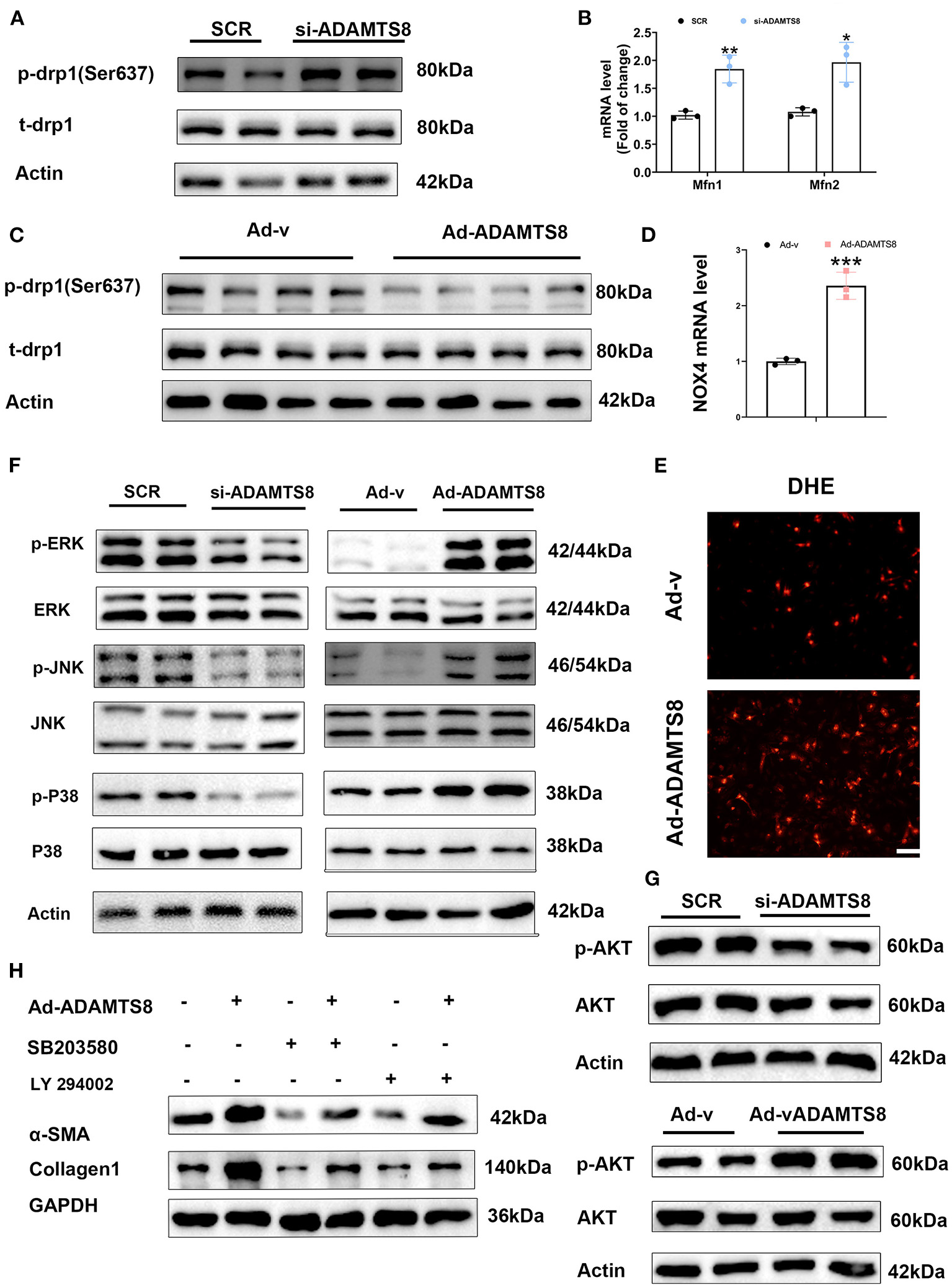 ADAMTS8-mediated mitochondrial dysfunction in cardiac fibroblasts and activated ROS-sensitive pathways to regulate the fibrotic response. (A,C) Representative Western blot of DRP-1 (p-drp1) phosphorylated at Ser637 and total drp1 (t-drp1) in cultured cardiac fibroblasts infected with si-ADAMTS8 or ADAMTS8-overexpressing adenovirus. (B) Real-time polymerase chain reaction (RT-PCR) analyses of Mfn1 and Mfn2 mRNA in cultured cardiac fibroblasts infected with si-ADAMTS8. Average expression values were normalized to GAPDH mRNA. (D) RT-PCR analyses of NOX4 mRNA in cultured cardiac fibroblasts infected with ADAMTS8-overexpressing adenovirus average expression values were normalized to GAPDH mRNA. (E) Representative images of dihydroethidium (DHE) staining of CFs infected with ADAMTS8-overexpressing adenovirus. (F,G) Activation of MAPK and AKT in cultured cardiac fibroblasts overexpressing ADAMTS8 or downregulating ADAMTS8 detected via western blotting. (H) Cultured cardiac fibroblasts infected with ADAMTS8 overexpressing adenovirus treated with the MAPK pathway inhibitor SB203580 or AKT inhibitor LY294002 (25 uM) after quiescence, followed by analysis of the cell lysates with indicated antibodies. Data were presented as mean ± SEM. *P < 0.05, **P < 0.01, and ***P < 0.001 between the two indicated groups.