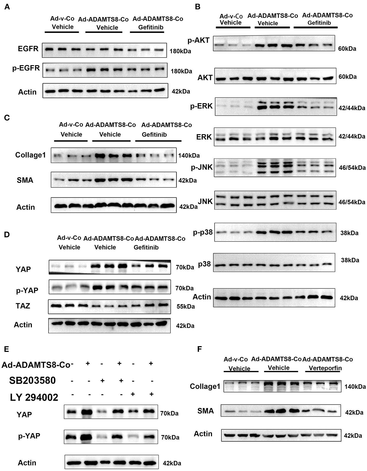 ADAMTS8 activated YAP, and inhibiting the EGFR expression blocked the ADAMTS8-induced YAP activation in cultured cardiac fibroblasts. (A,B) The phosphorylation levels of EGFR and its downstream MAPK and AKT were all attenuated in the gefitinib group. (C) EGFR inhibitor abated ADAMTS8-induced cardiac fibroblast activation. (D) Cardiac fibroblasts co-cultured with cardiomyocytes transfected with ADAMTS8 overexpressing adenovirus (Ad-ADAMTS8-Co) were treated with or without gefitinib, followed by analysis of the cell lysates with indicated antibodies. (E) The protein levels of collagen1 and α-SMA were all partly declined in the verteporfin group. (F) Cardiac fibroblasts co-cultured with cardiomyocytes infected with ADAMTS8 overexpressing adenovirus were treated with the MAPK pathway inhibitor SB203580 or AKT inhibitor LY294002 after quiescence, followed by analysis of the cell lysates with indicated antibodies.