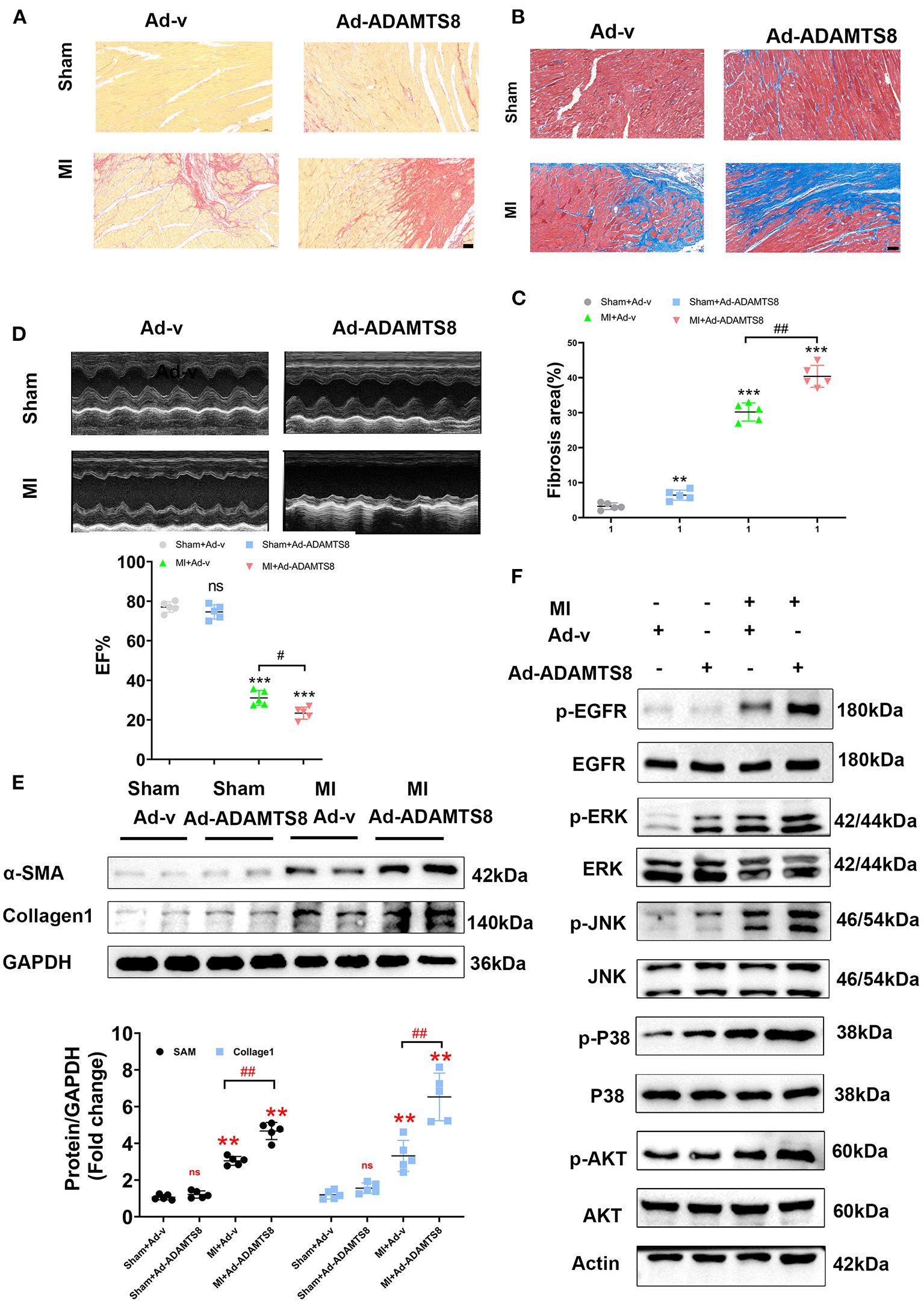ADAMTS8 overexpression promoted cardiac fibrosis and impaired cardiac function in vivo. (A–C) Representative pictures from Sirius red and Masson staining and quantitative analysis of interstitial fibrotic area in the infarct border zone of Ad-v Sham, Ad-ADAMTS8 Sham, Ad-v MI, and Ad-ADAMTS8 MI rats (scale bar = 50 μm). (D) Representative M-mode images of Ad-v Sham, Ad-ADAMTS8 Sham, Ad-v MI, and Ad-ADAMTS8 MI groups; EF was quantified via echocardiography. (E) Collage1 and α-SMA expression levels were quantified by western blotting. (F) Activation of the EGFR, MAPK, and AKT signaling pathways of a rat model of MI following adenovirus injection was detected via western blotting in vivo. Data were presented as mean ± SEM. **P < 0.01, ***P < 0.001, #P < 0.05, ##P < 0.01, and NS indicates no significance between the two indicated groups.