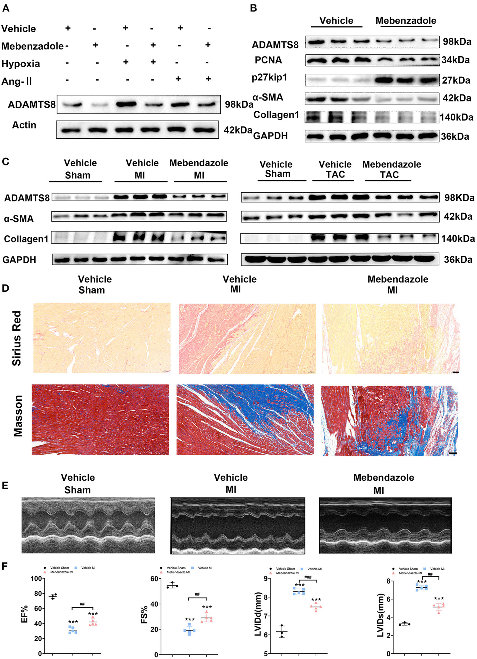 Mebendazole down-regulated ADAMTS8 and ameliorated cardiac fibrosis and heart failure. (A) Representative Western blots and quantification of ADAMTS8 in cardiac fibroblasts treated with mebendazole (5 mol/L) for 48 h (n = 3 each). (B) Representative Western blots and quantification of ADAMTS8, PCNA, p27kip1, α-SMA, and Collage1 expression in CFs treated with or without Mebendazole (n = 3 each). (C) Representative Western blotting of ADAMTS8, α-SMA, and Collagen1 protein levels in the LVs of rats followed by treatment with vehicle or mebendazole for 14 days after MI or TAC (n = 5 each). (D) Representative pictures from Sirius red and Masson staining in the infarct border zone of rats followed by treatment with vehicle or mebendazole for 21 days after MI(scale bar = 100 μm). (E,F) Representative M-mode echocardiograms obtained on 28th day post-MI. Cardiac function was measured by detecting EF%, FS%, LVDD, and LVSD post-MI. Data were presented as mean ± SEM. ***P < 0.001, ##P < 0.01 and ###P < 0.001 between the two indicated groups.