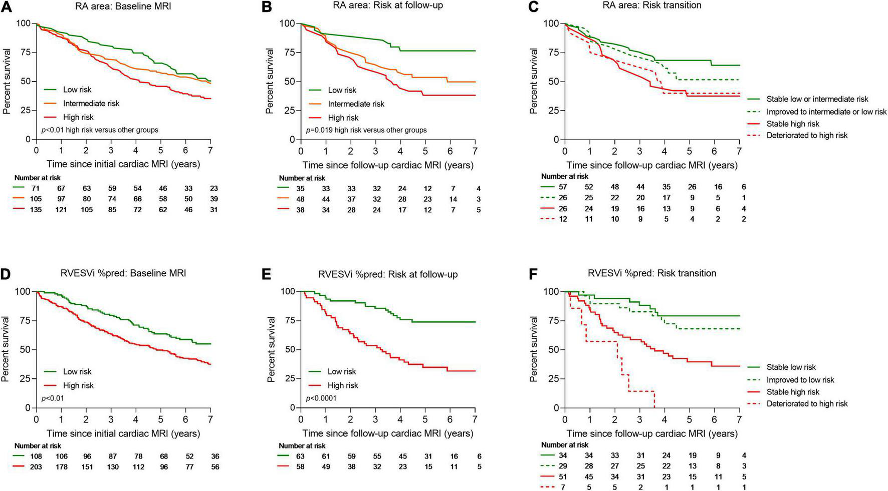 Kaplan–Meier survival curves for treatment naïve patients for RA area at baseline (A), RA area at follow-up cardiac MRI (B), transition of risk between baseline and follow-up cardiac MRI for RA area (C), RVESVi %pred at baseline (D), RVESVi %pred at follow-up cardiac MRI (E), and transition of risk between baseline and follow-up cardiac MRI for RVESVi %pred (F). MRI, magnetic resonance imaging; RA, right atrial; %pred, percentage predicted for age and sex; RVESVi, right ventricular end-systolic volume index.