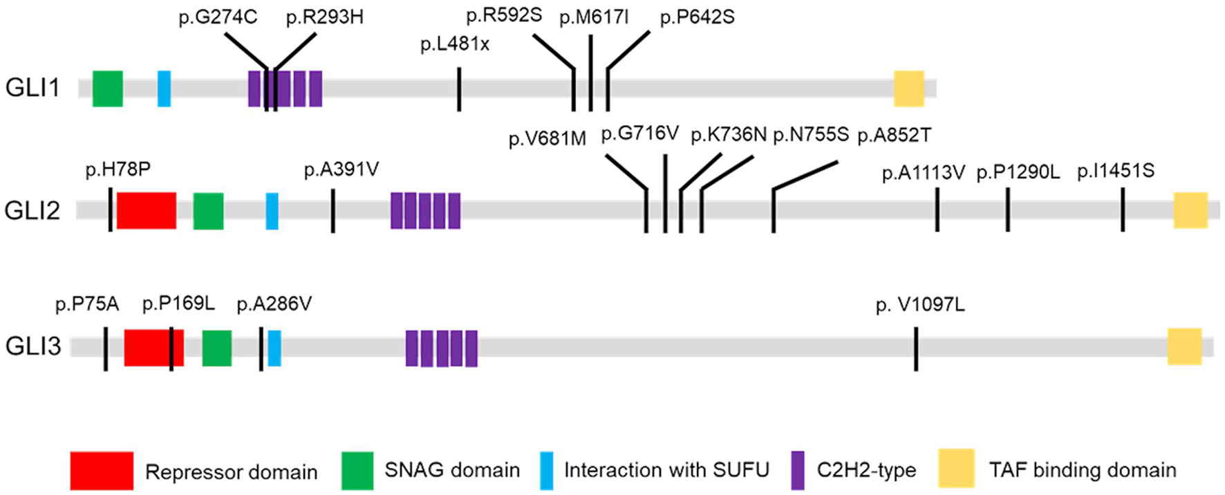 GLI1-3 mutations were identified in CHD patients. Schematic diagram of case-specific mutations in GLI1, GLI2 and GLI3 protein.
